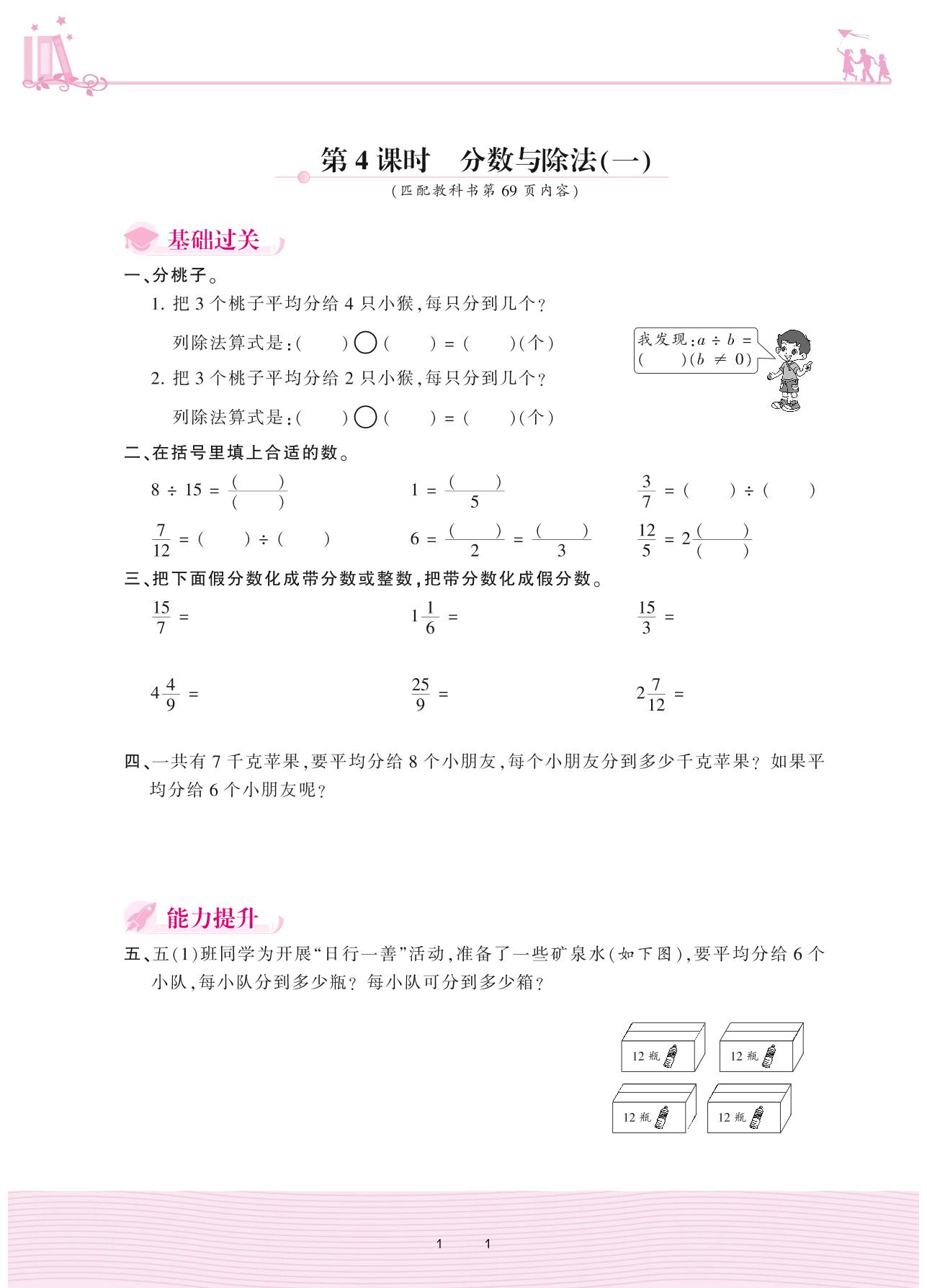2020上册五年级数学北师版 五 分数的意义——第4课时 分数与除法(一)