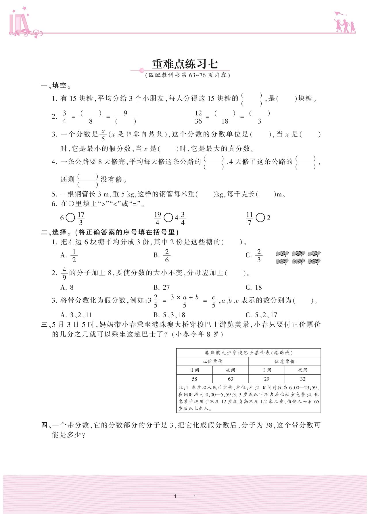 2020上册五年级数学北师版 五 分数的意义——重难点练习七