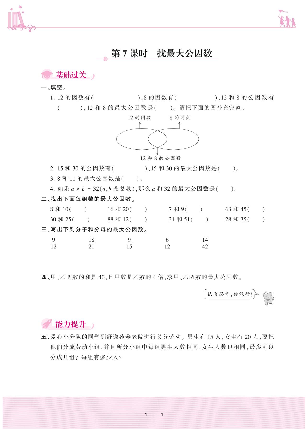 2020上册五年级数学北师版 五 分数的意义——第7课时 找最大公因数