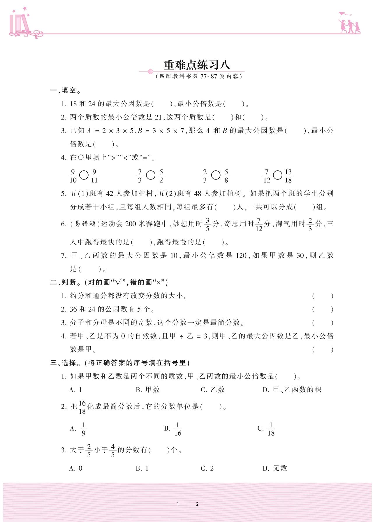 2020上册五年级数学北师版 五 分数的意义——重难点练习八