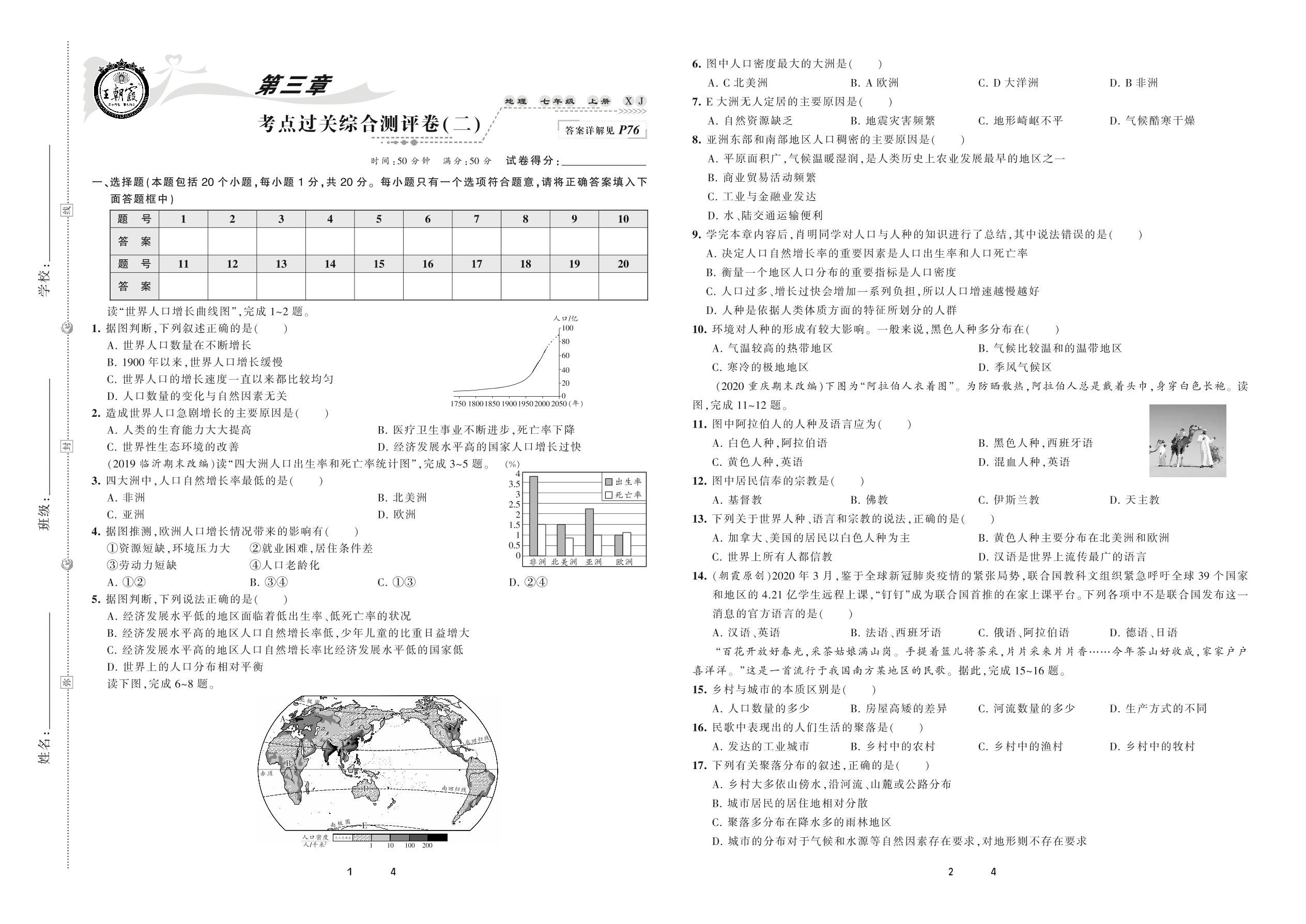2020上册七年级地理湘教版 第三章 考点过关综合测评卷(二)