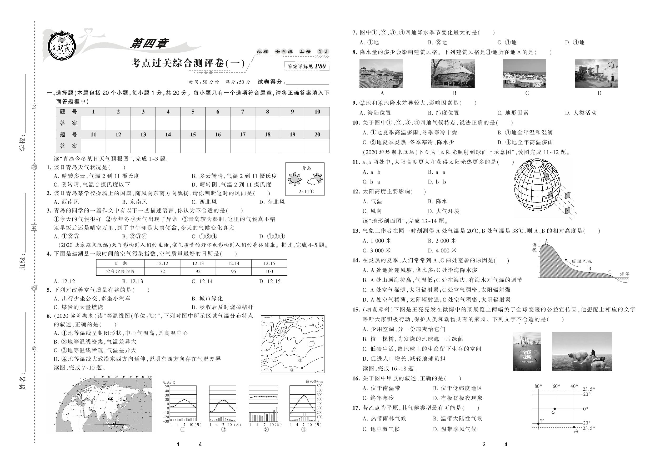 2020上册七年级地理湘教版 第四章 考点过关综合测评卷(一)