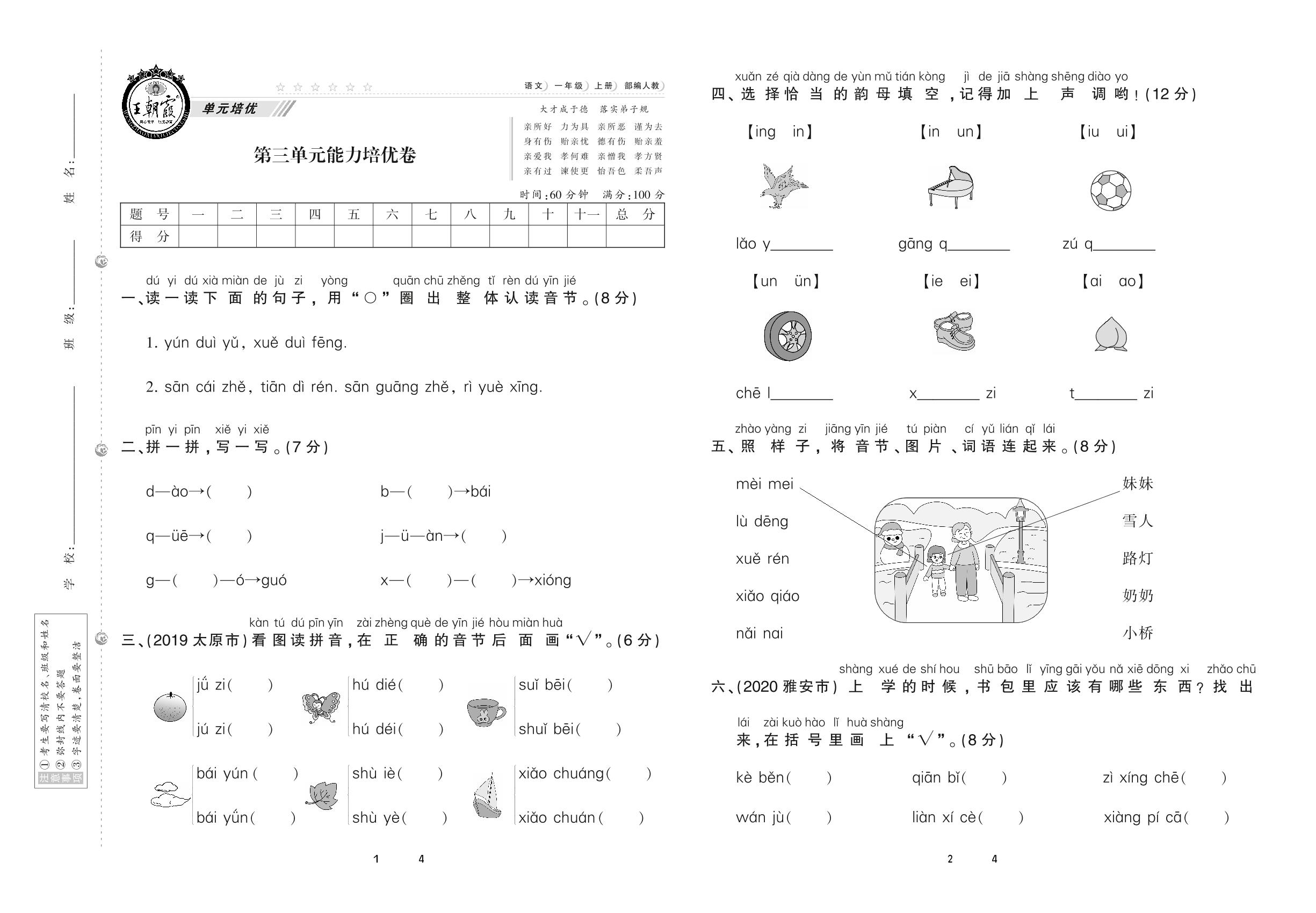 2020上册一年级语文人教版 第三单元 能力培优卷