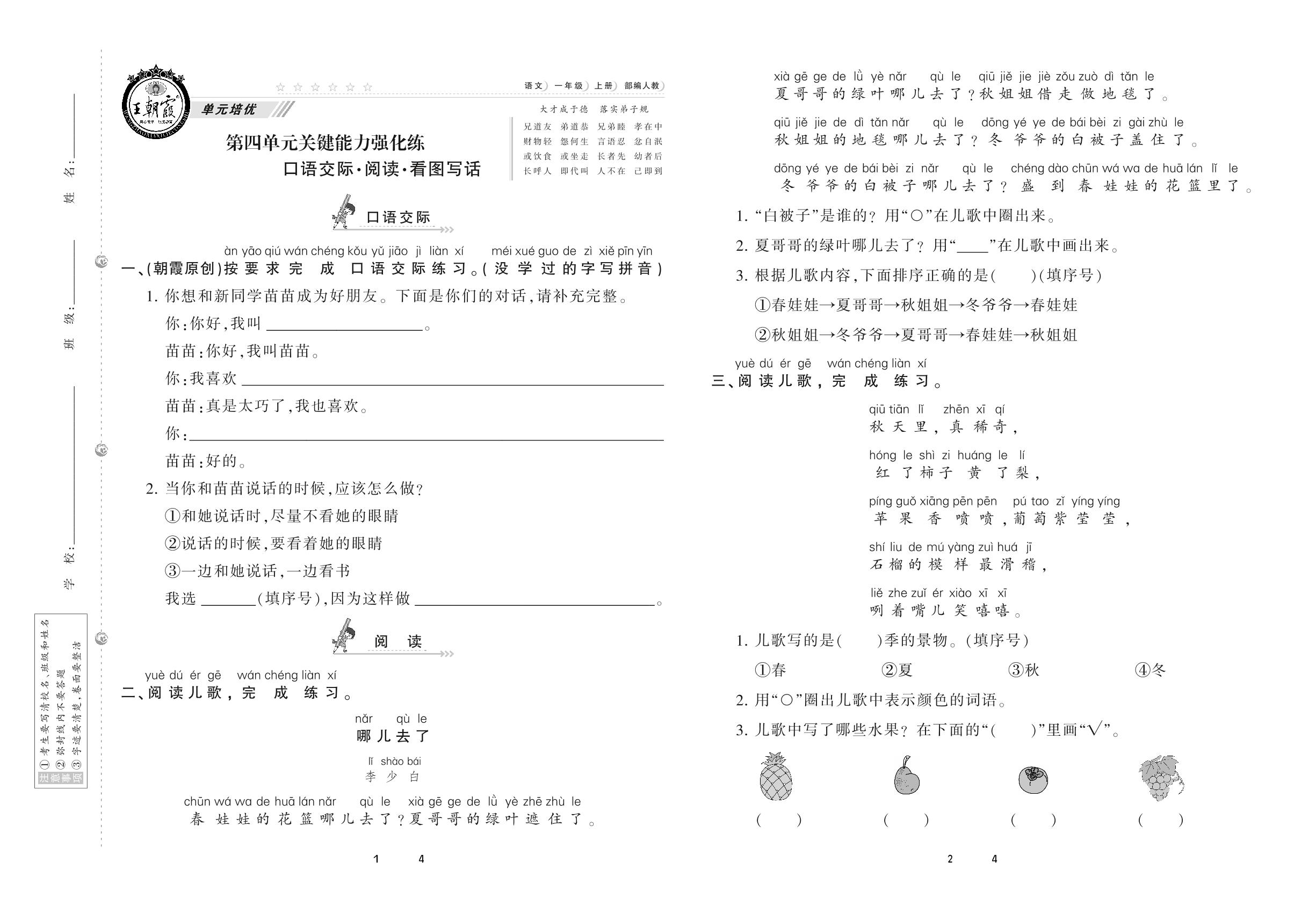 2020上册一年级语文人教版 第四单元 关键能力强化练