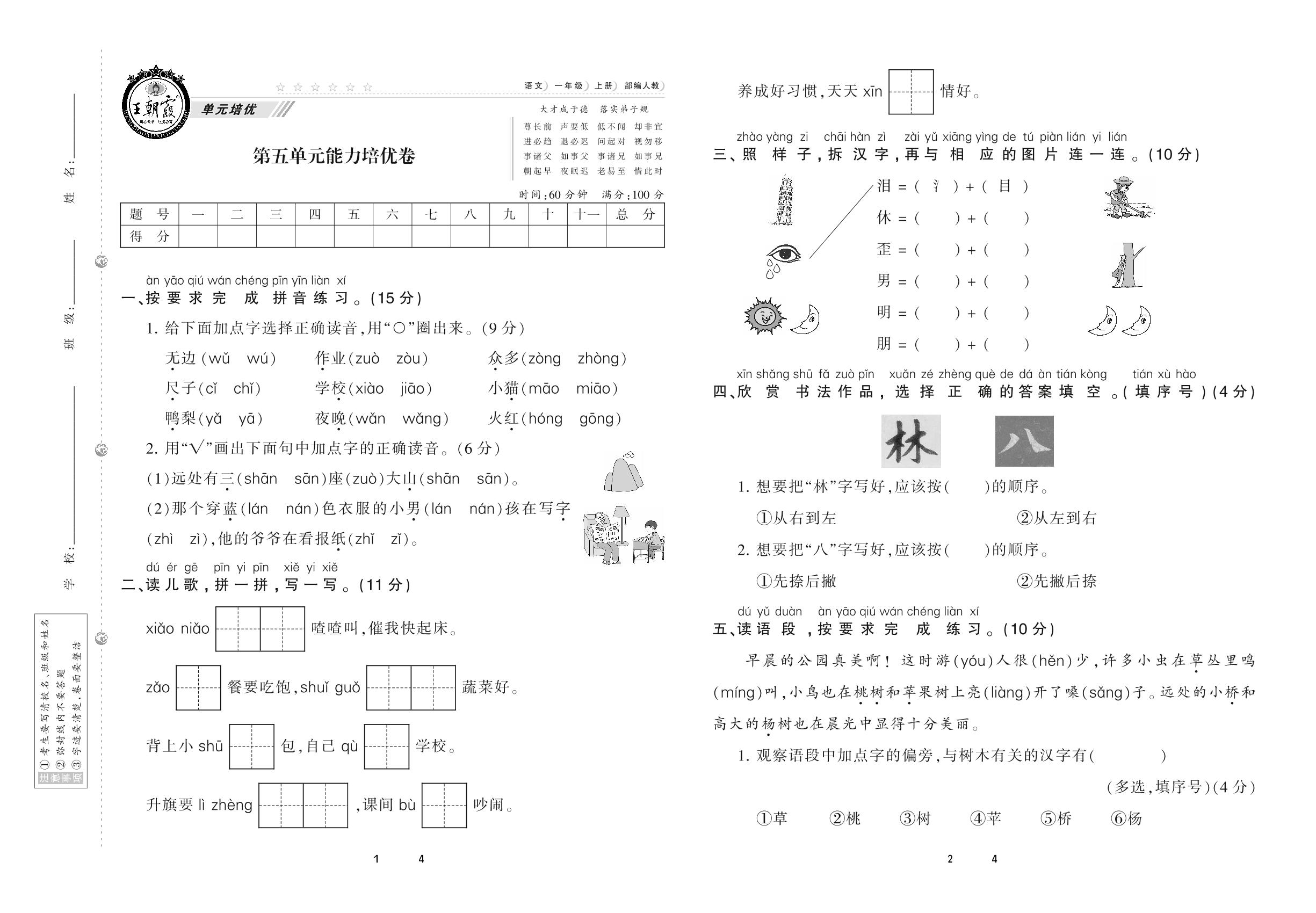 2020上册一年级语文人教版 第五单元 能力培优卷