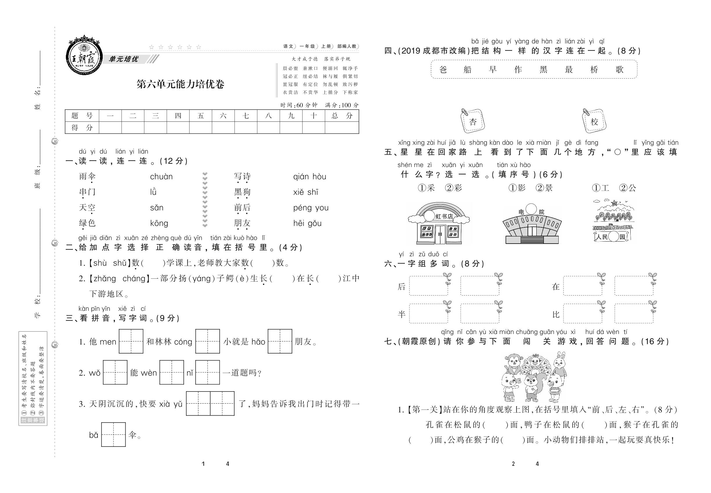 2020上册一年级语文人教版 第六单元 能力培优卷