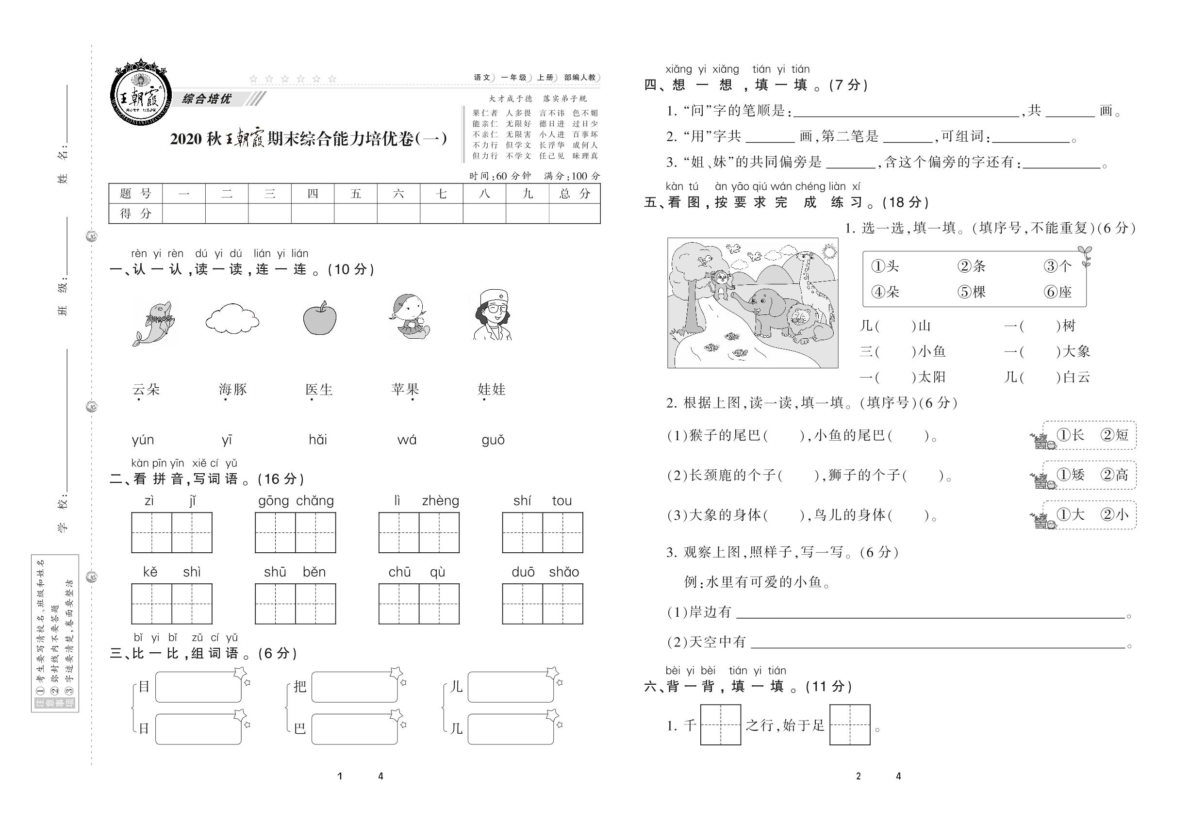2020上册一年级语文人教版 王朝霞期末综合能力培优卷(一)