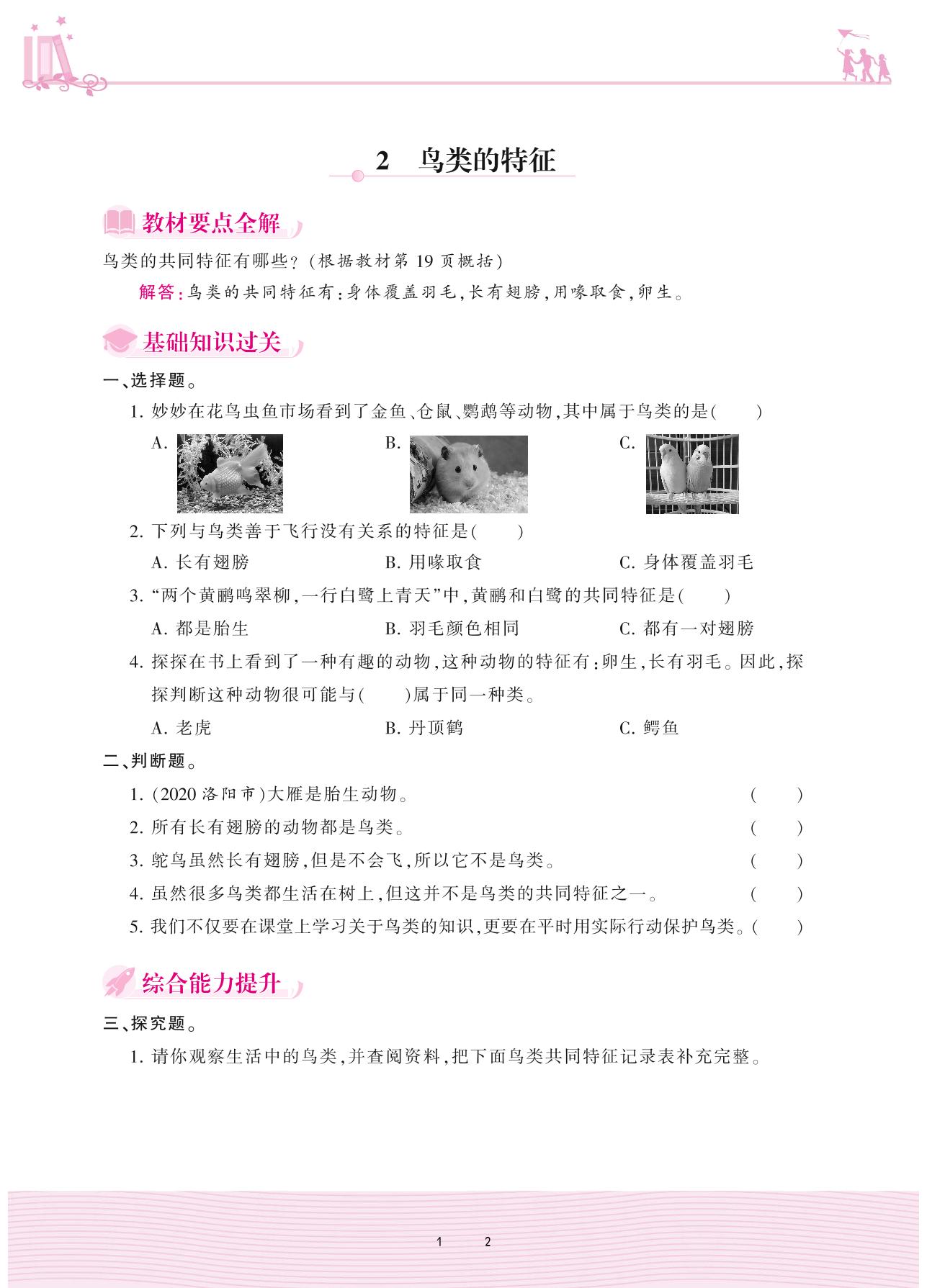 2020上册三年级科学大象版 第二单元 动物的特征——2 鸟类的特征
