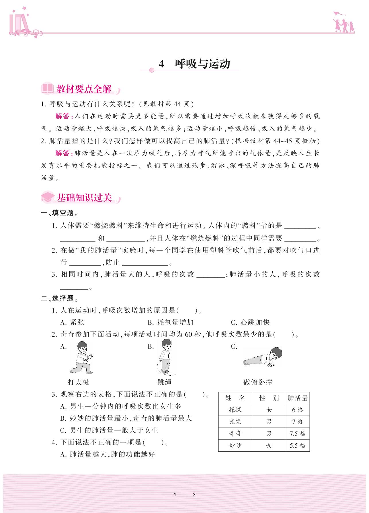 2020上册四年级科学大象版 第四单元 人体的呼吸器官——4 呼吸与运动