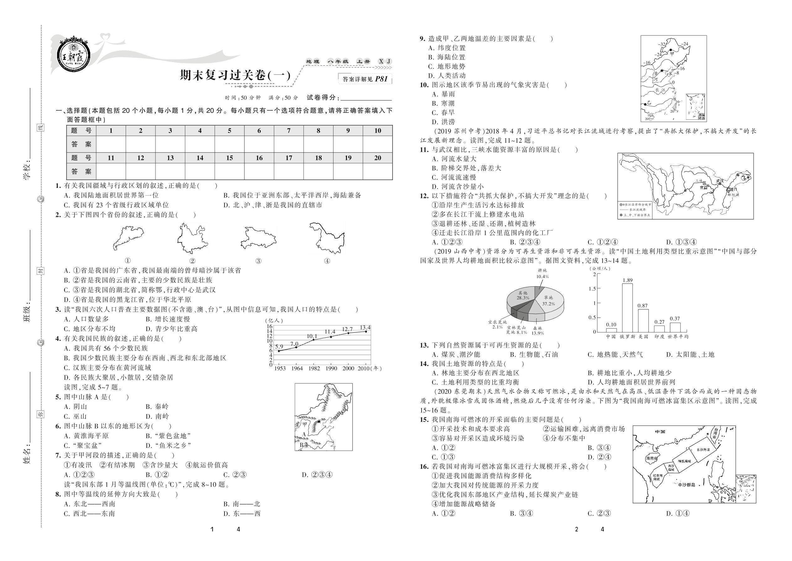 2020上册八年级地理湘教版 期末复习过关卷(一)