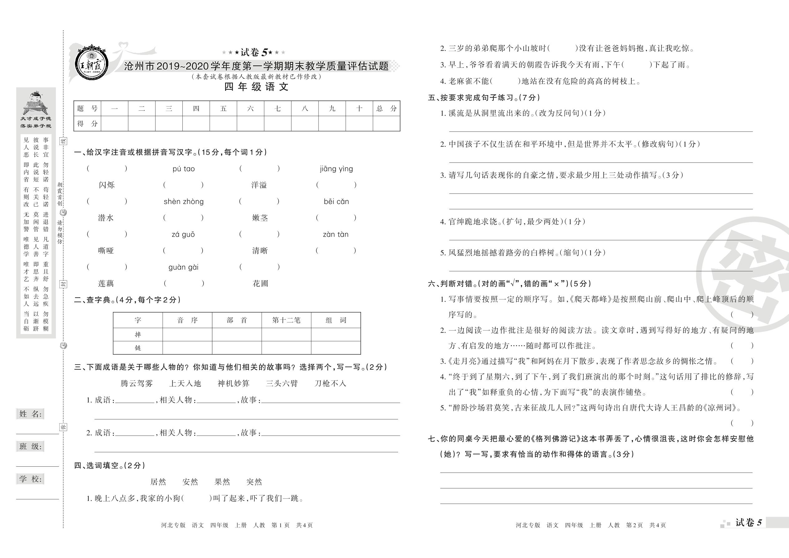 2019-2020学年第一学期沧州市四年级语文试卷(人教版)【5】