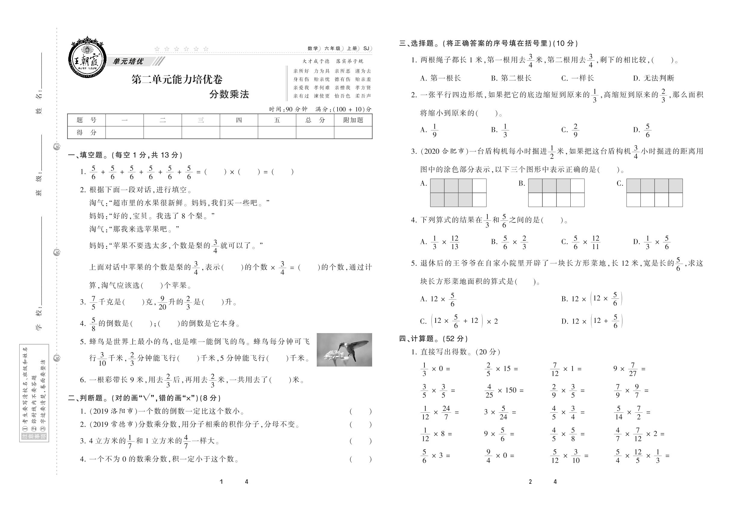 2020上册六年级数学苏教版 第二单元 能力培优卷