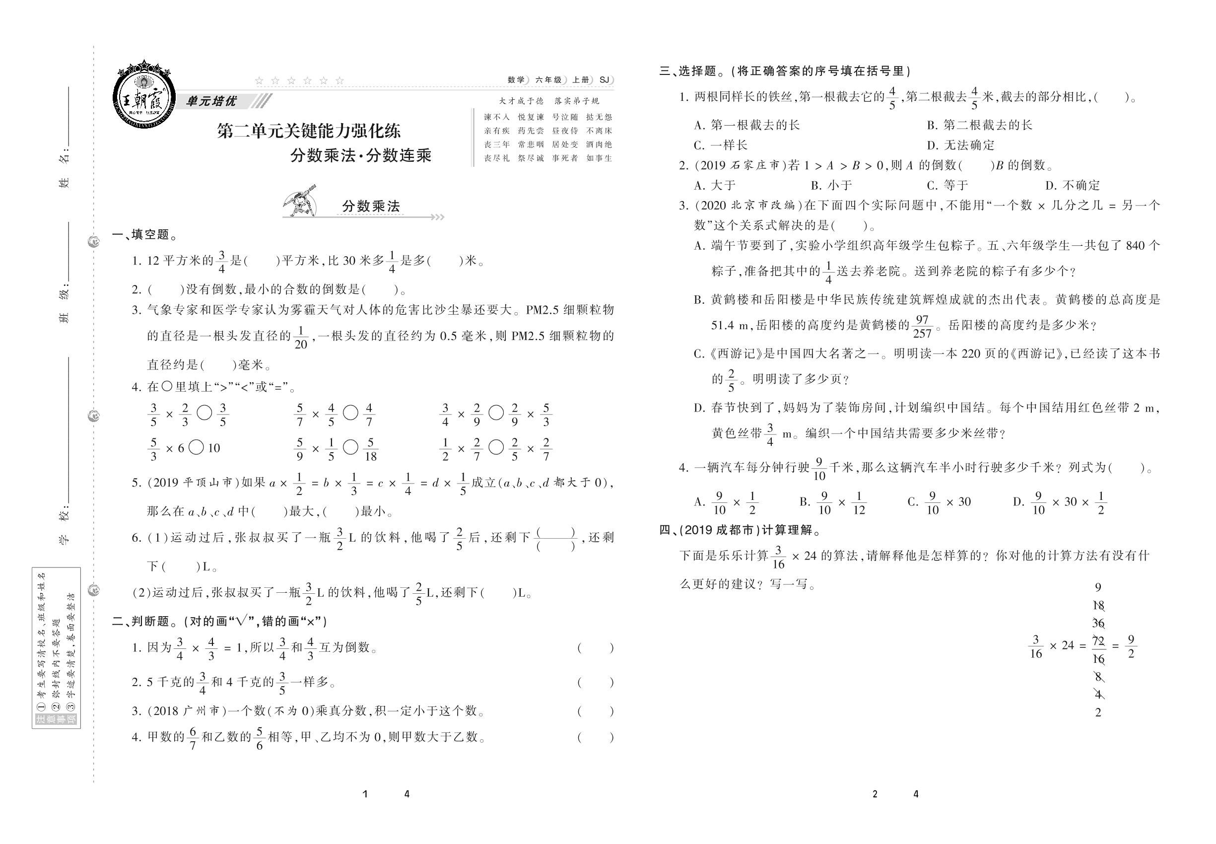 2020上册六年级数学苏教版 第二单元 关键能力强化练