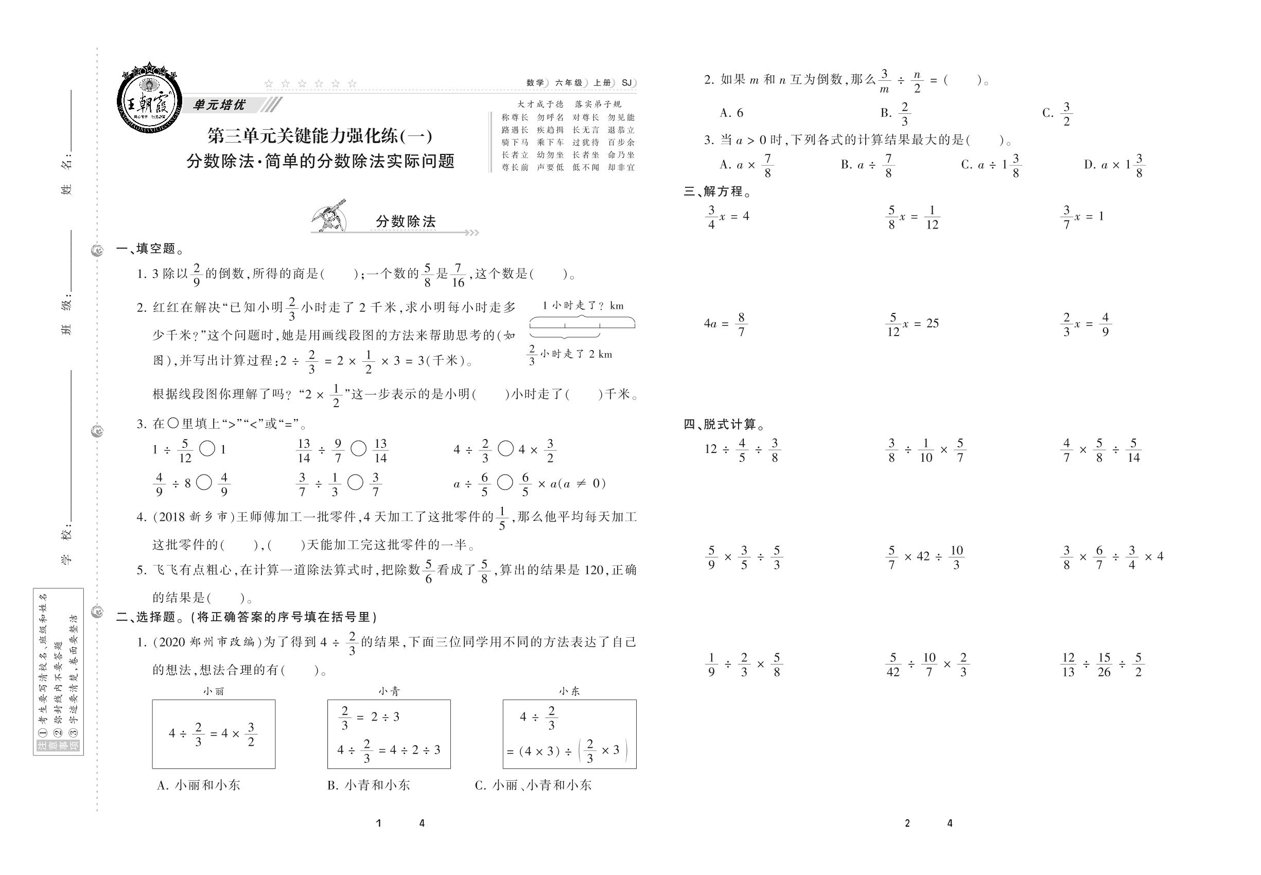 2020上册六年级数学苏教版 第三单元 关键能力强化练(一)