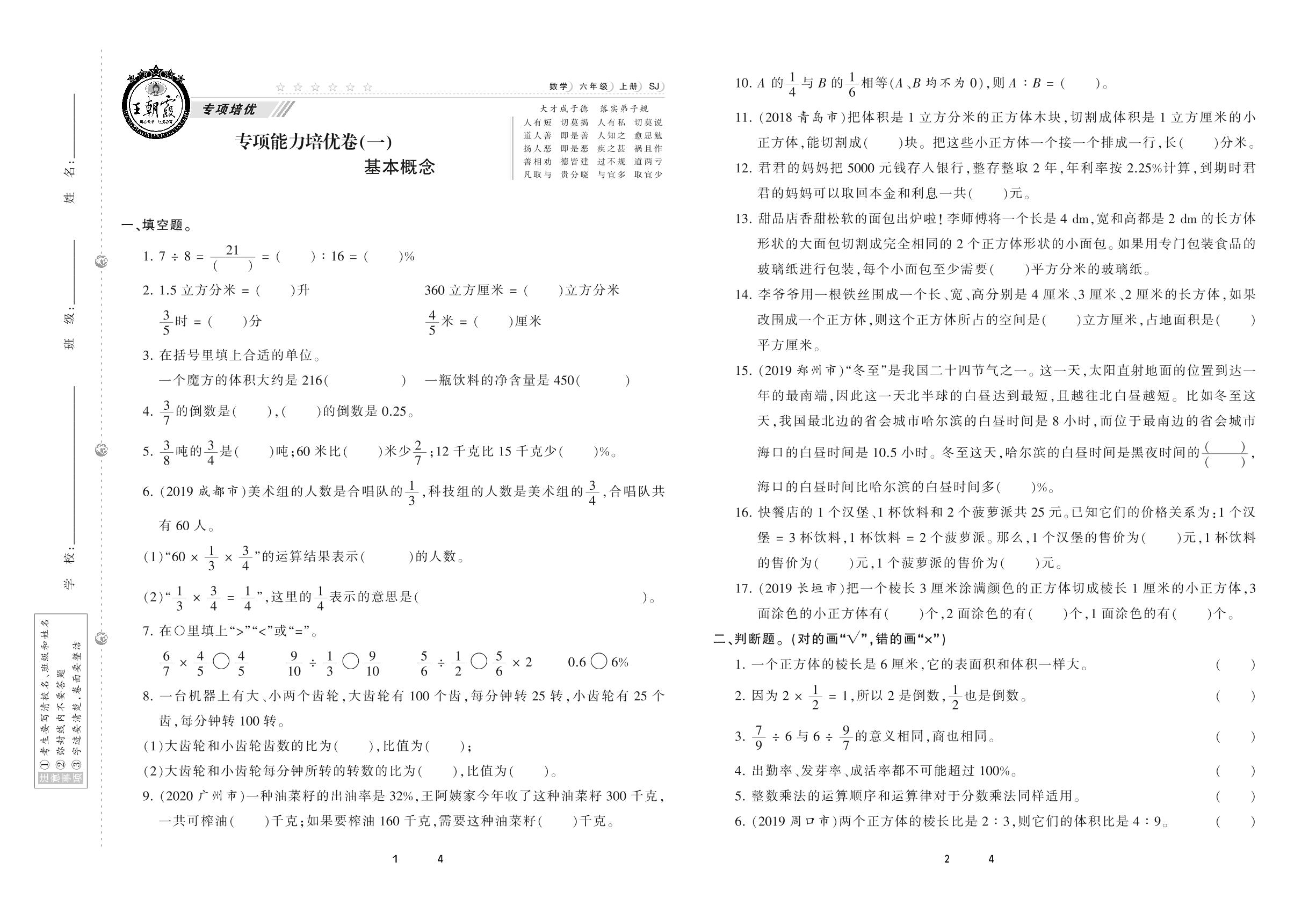 2020上册六年级数学苏教版 专项能力培优卷(一) 基本概念