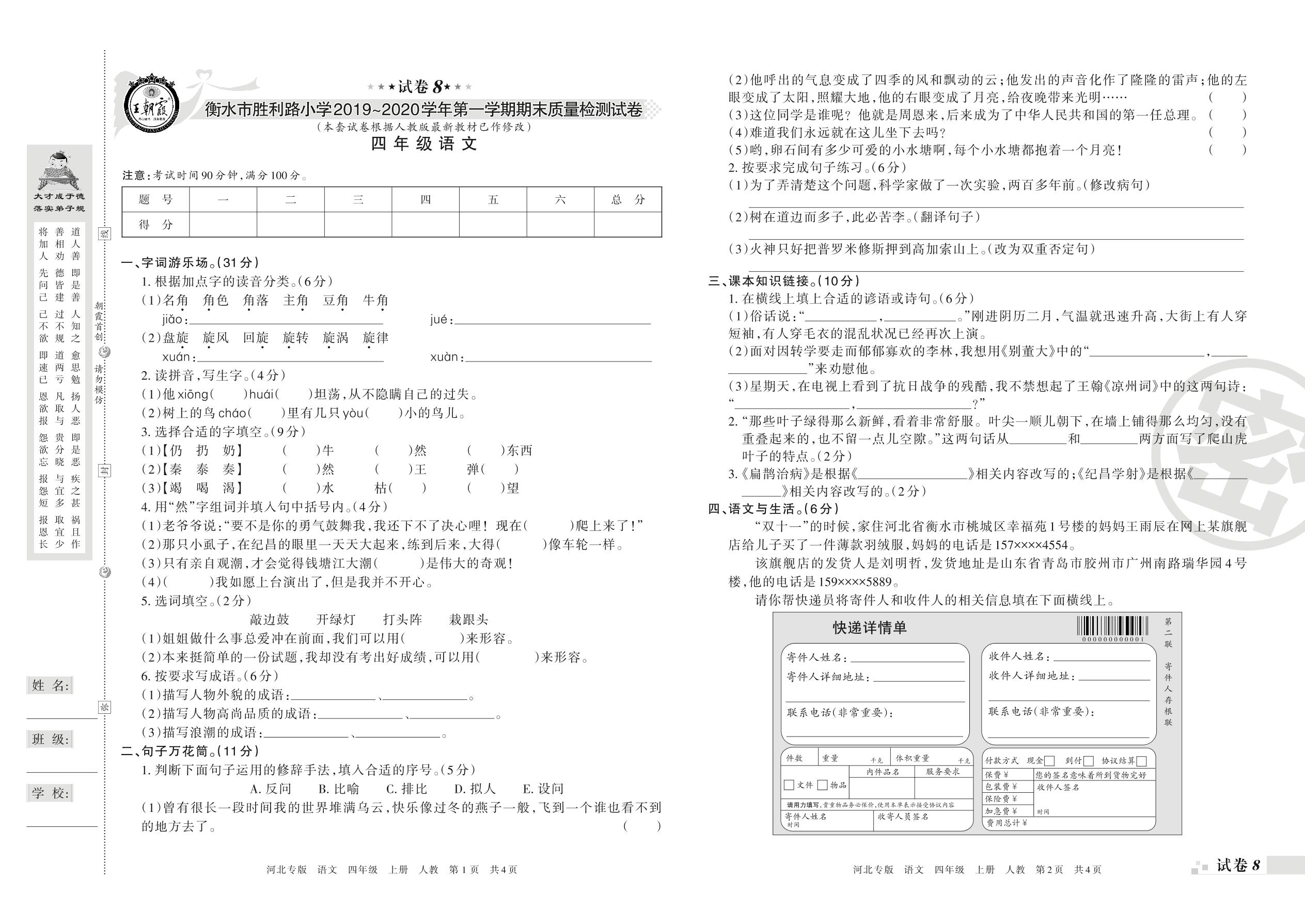 2019-2020学年第一学期衡水市胜利路小学四年级语文试卷(人教版)【8】