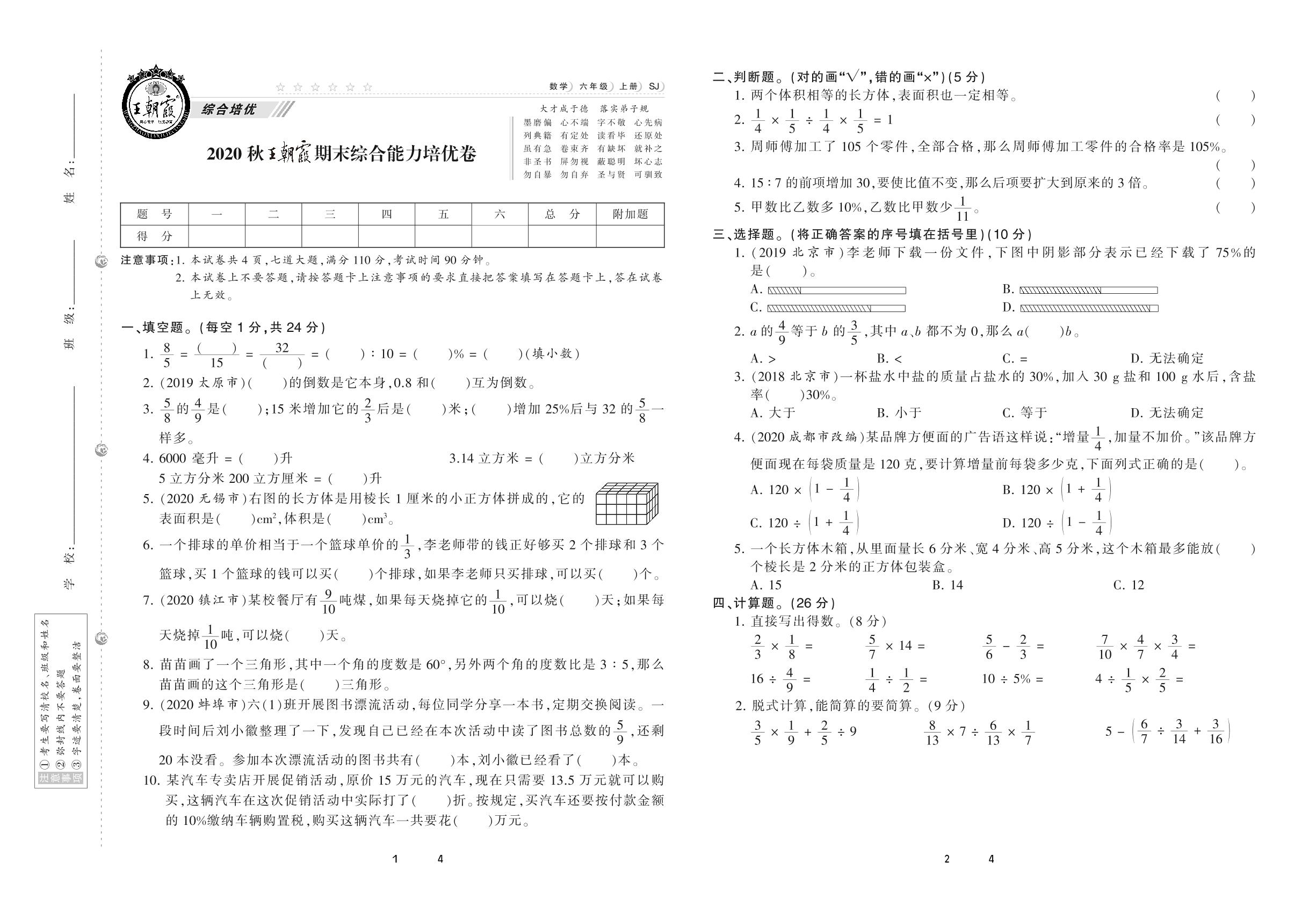 2020上册六年级数学苏教版 王朝霞期末综合能力培优卷