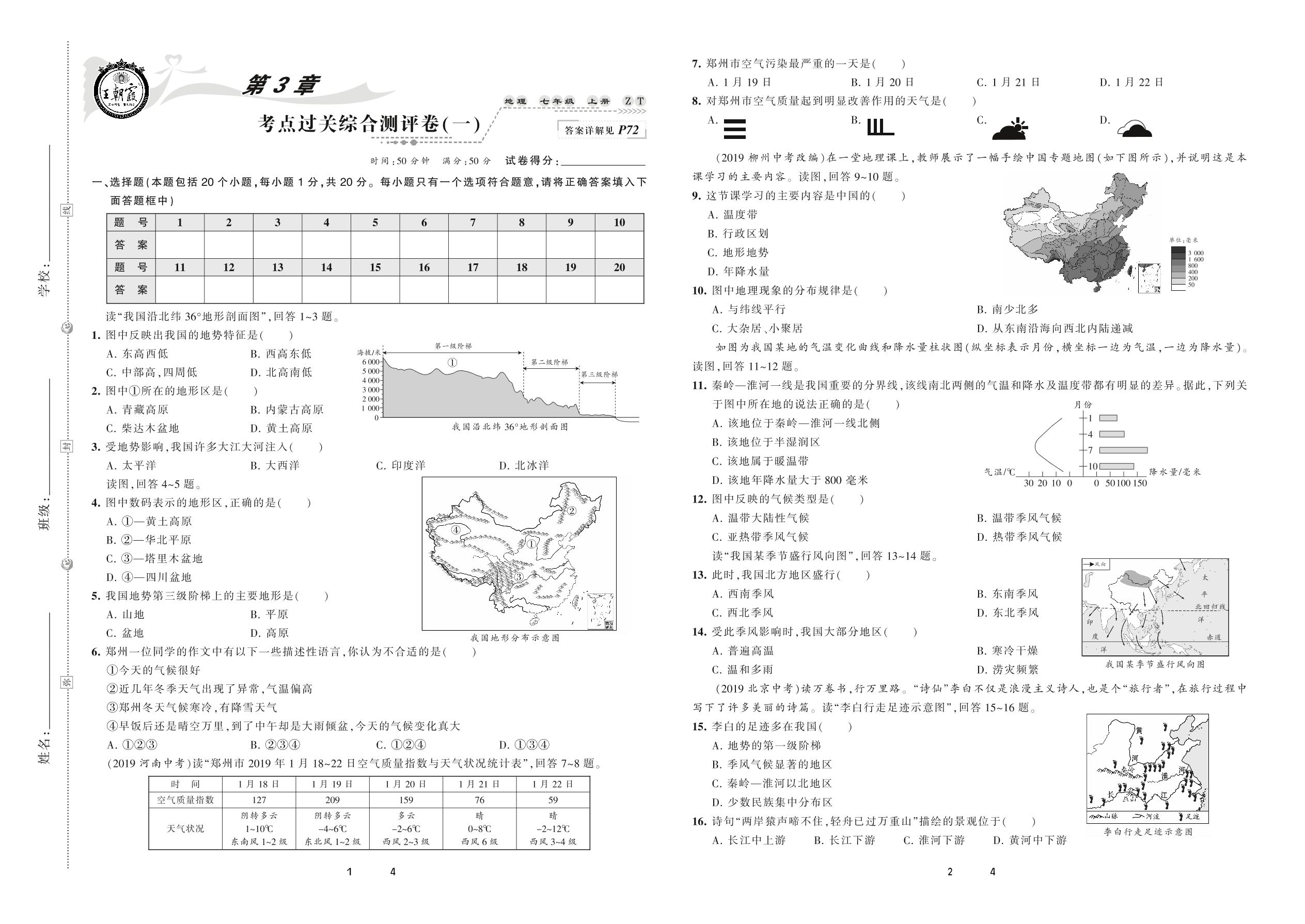 2020上册七年级地理中图版 第3章 考点过关综合测评卷(一)