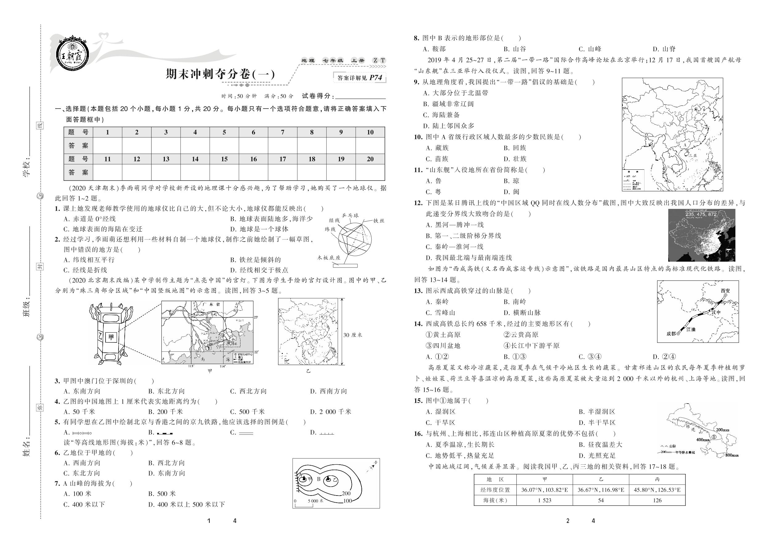 2020上册七年级地理中图版 期末冲刺夺分卷(一)