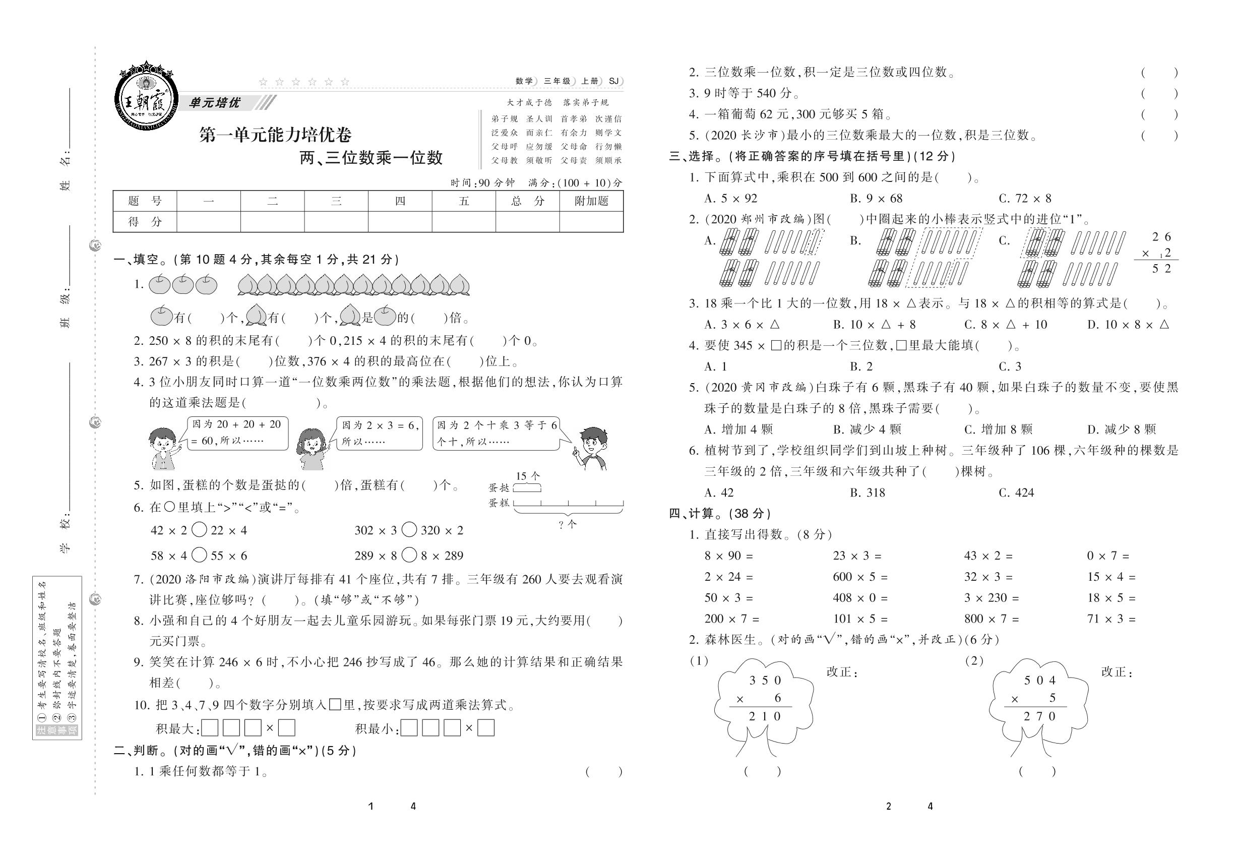 2020上册三年级数学苏教版 第一单元 能力培优卷