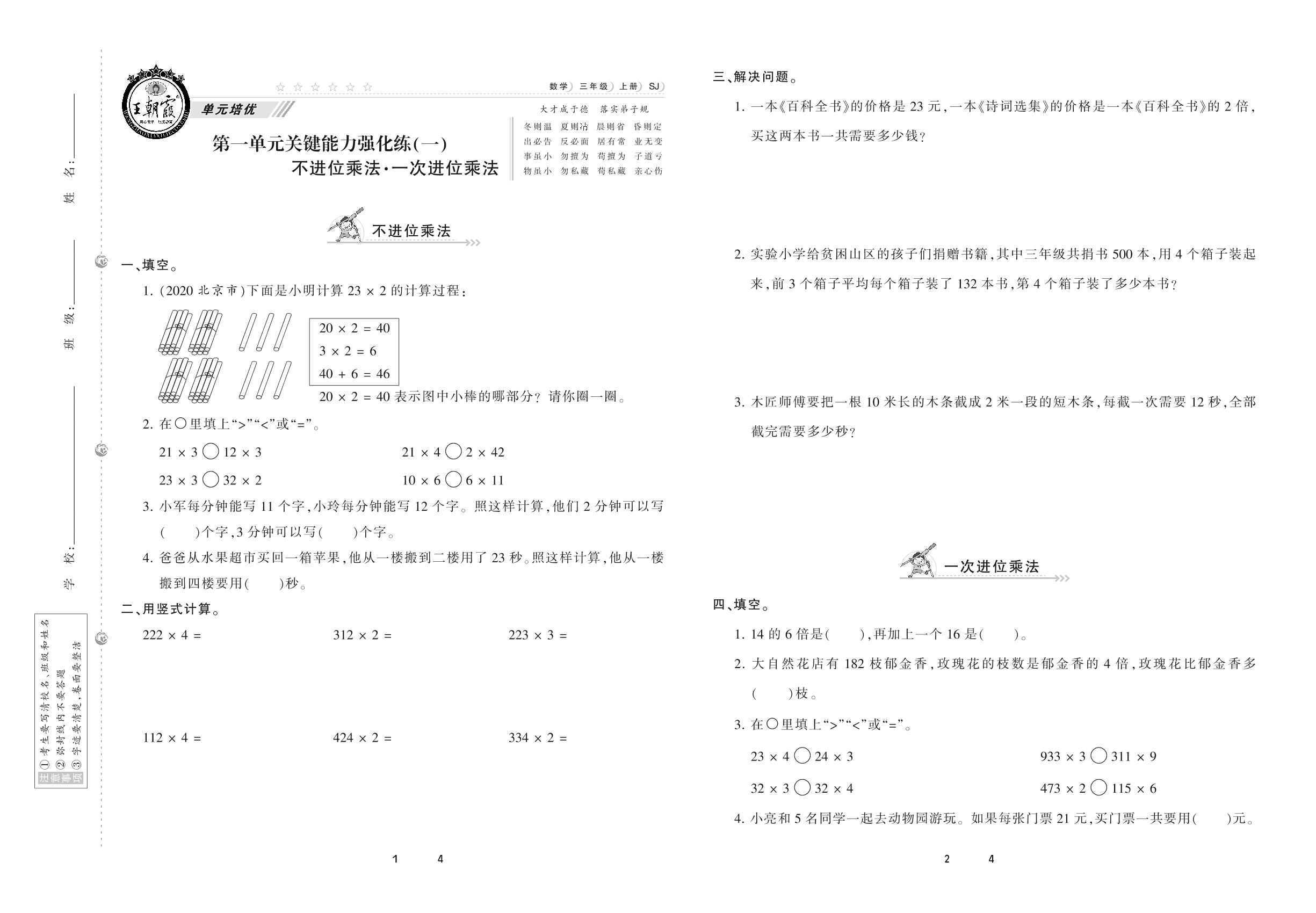 2020上册三年级数学苏教版 第一单元 关键能力强化练(一)