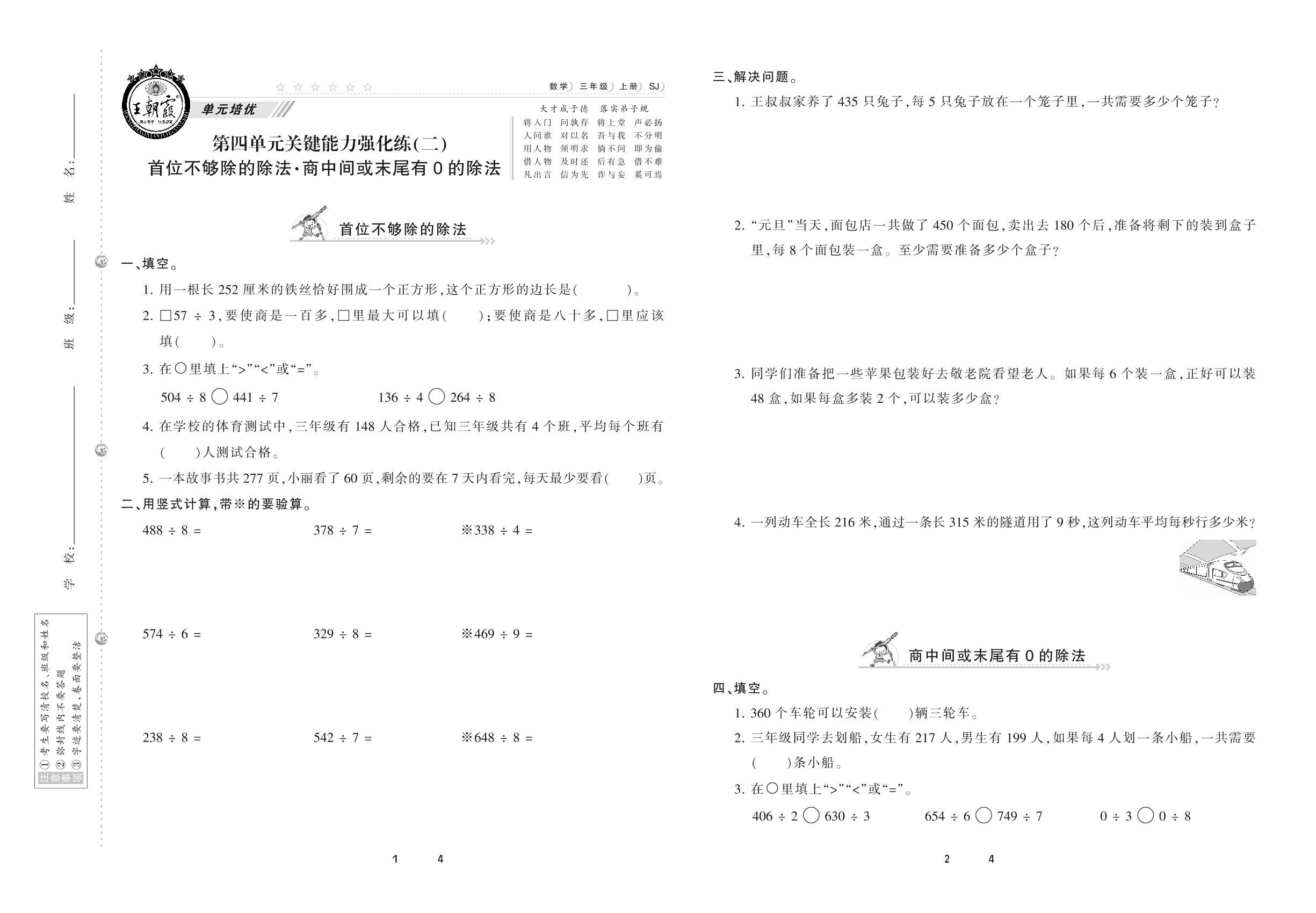 2020上册三年级数学苏教版 第四单元 关键能力强化练(二)