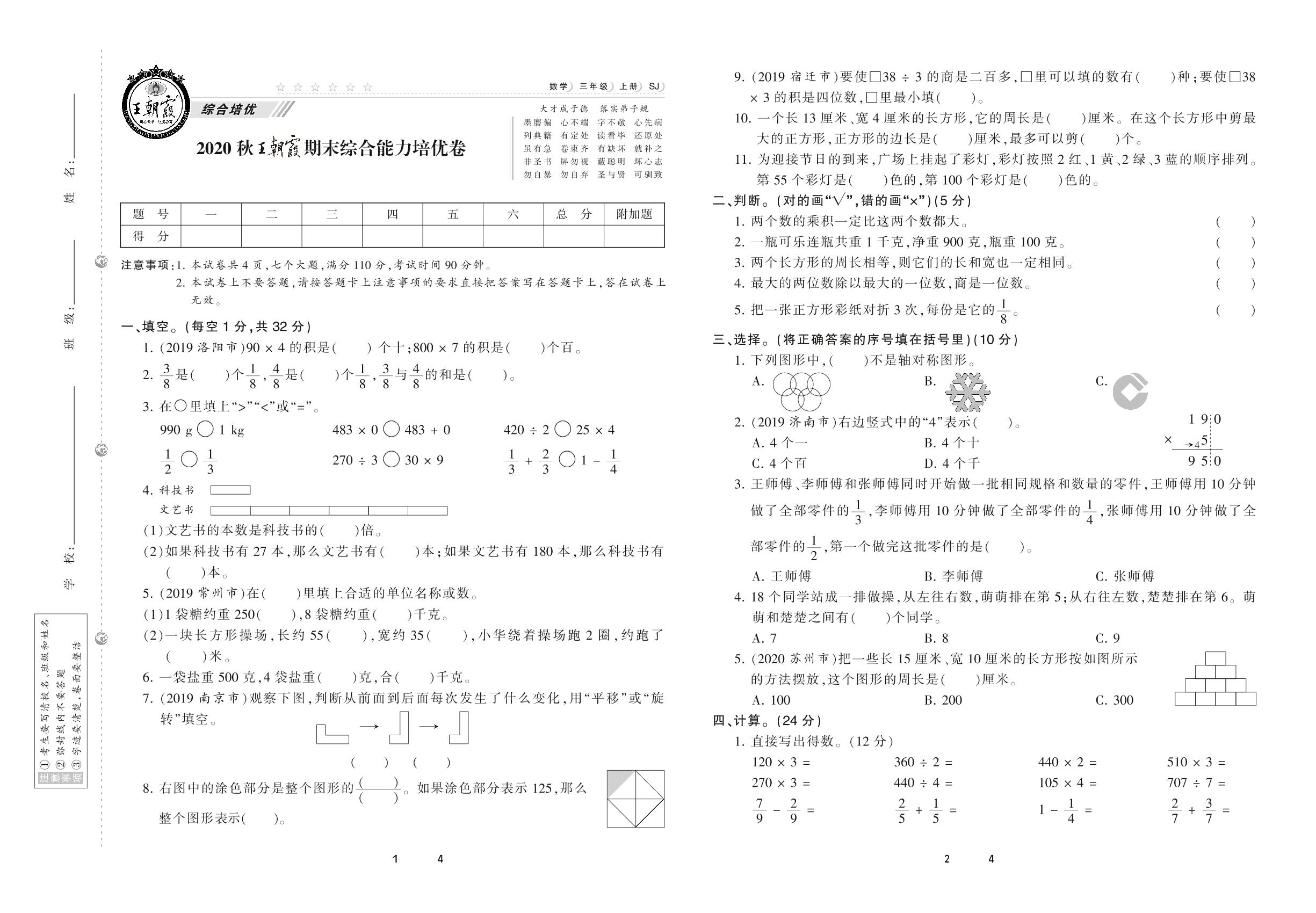 2020上册三年级数学苏教版 王朝霞期末综合能力培优卷