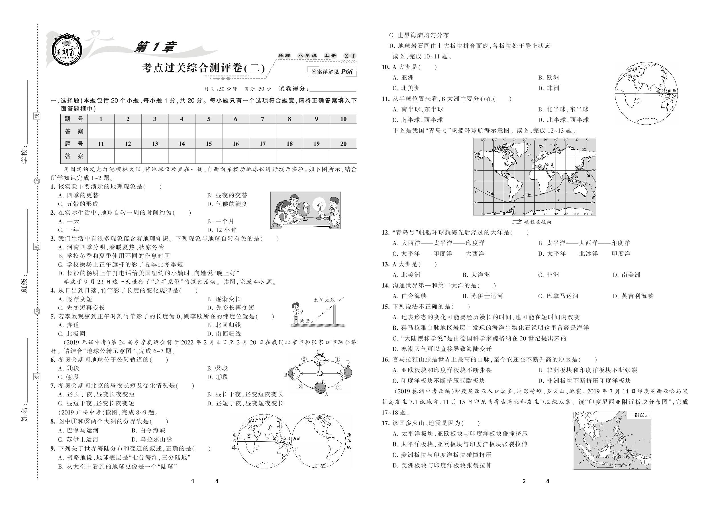 2020上册八年级地理中图版 第1章 考点过关综合测评卷(二)