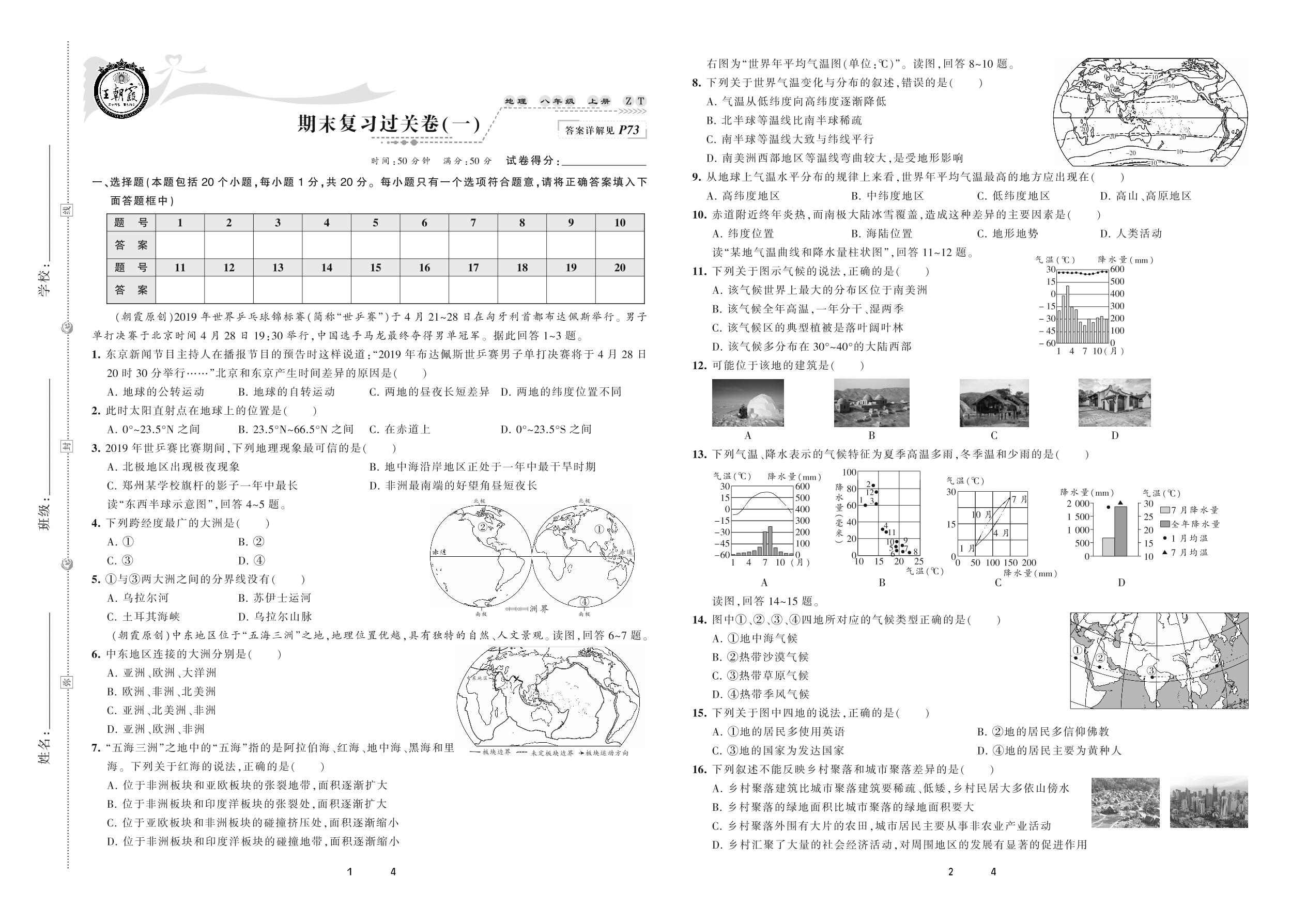 2020上册八年级地理中图版 期末复习过关卷(一)