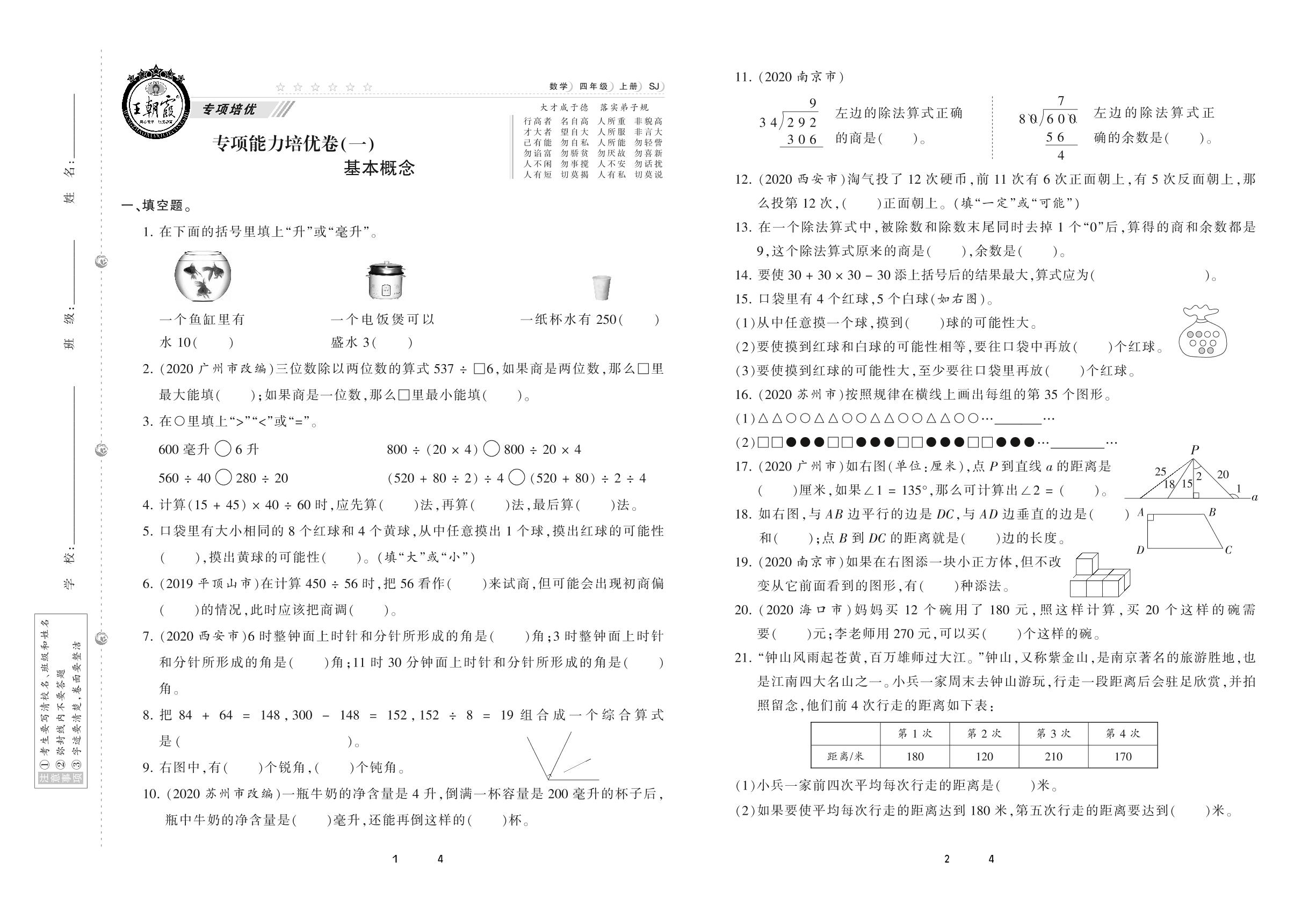 2020上册四年级数学苏教版 专项能力培优卷(一)基本概念