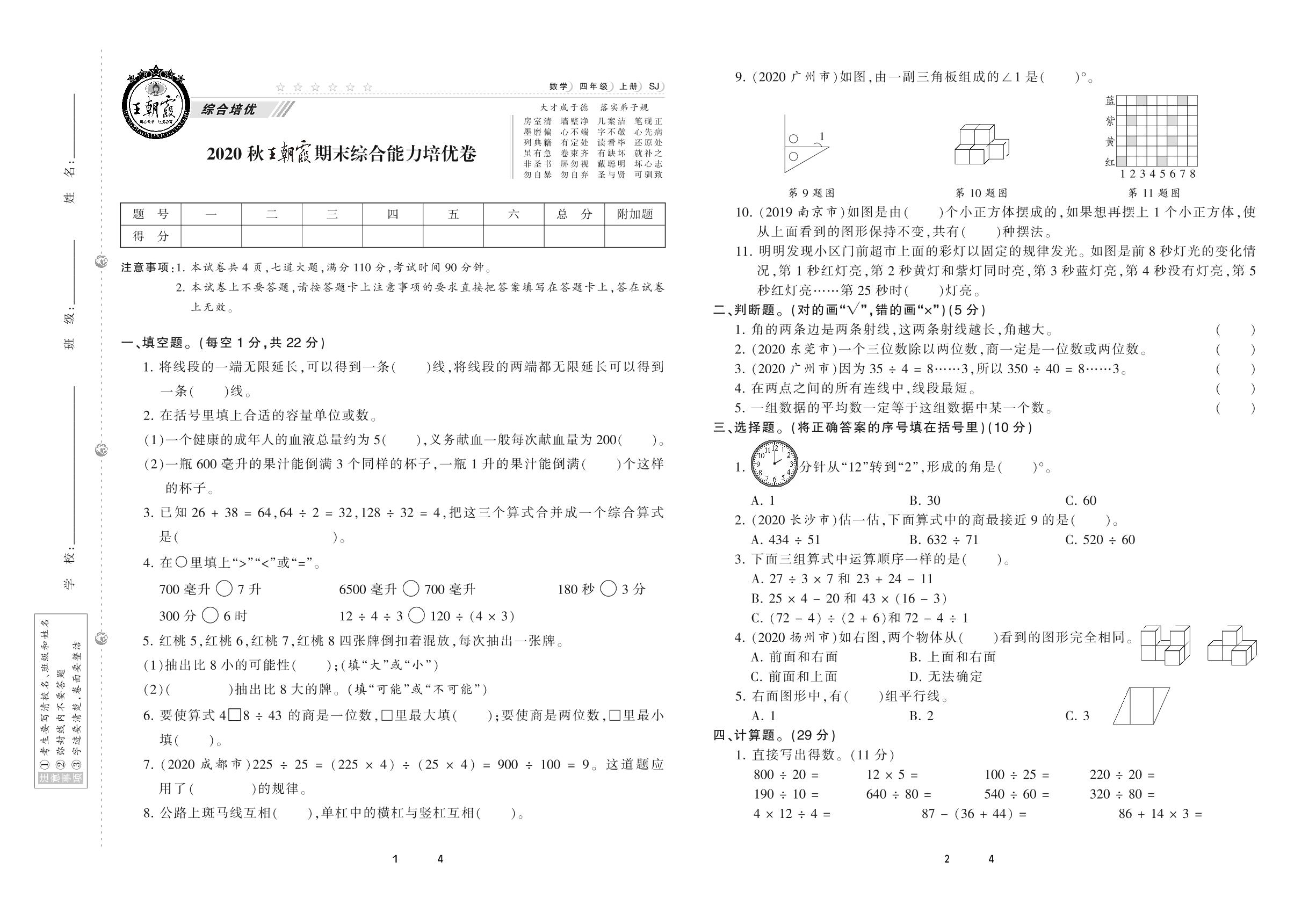 2020上册四年级数学苏教版 王朝霞期末综合能力培优卷