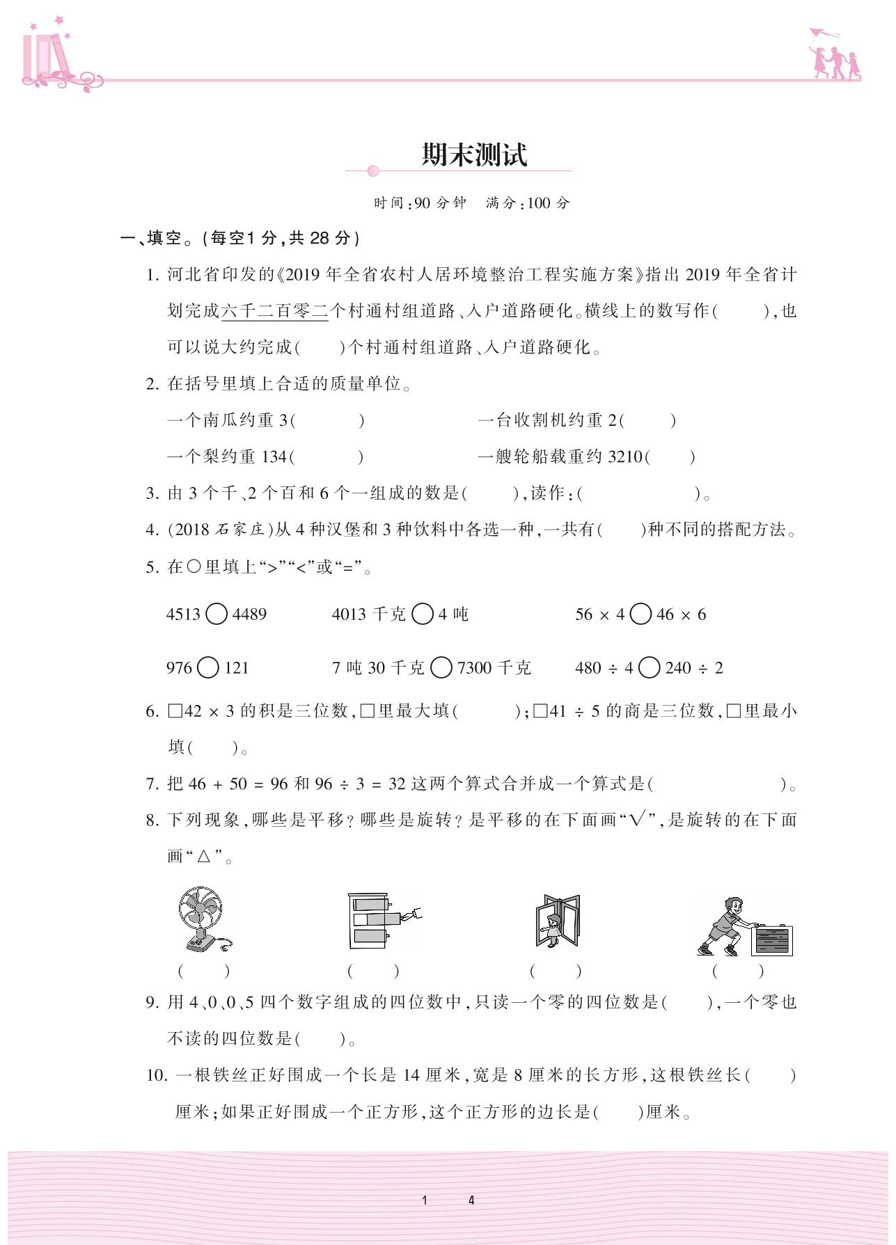 2020上册三年级数学冀教版 期末测试