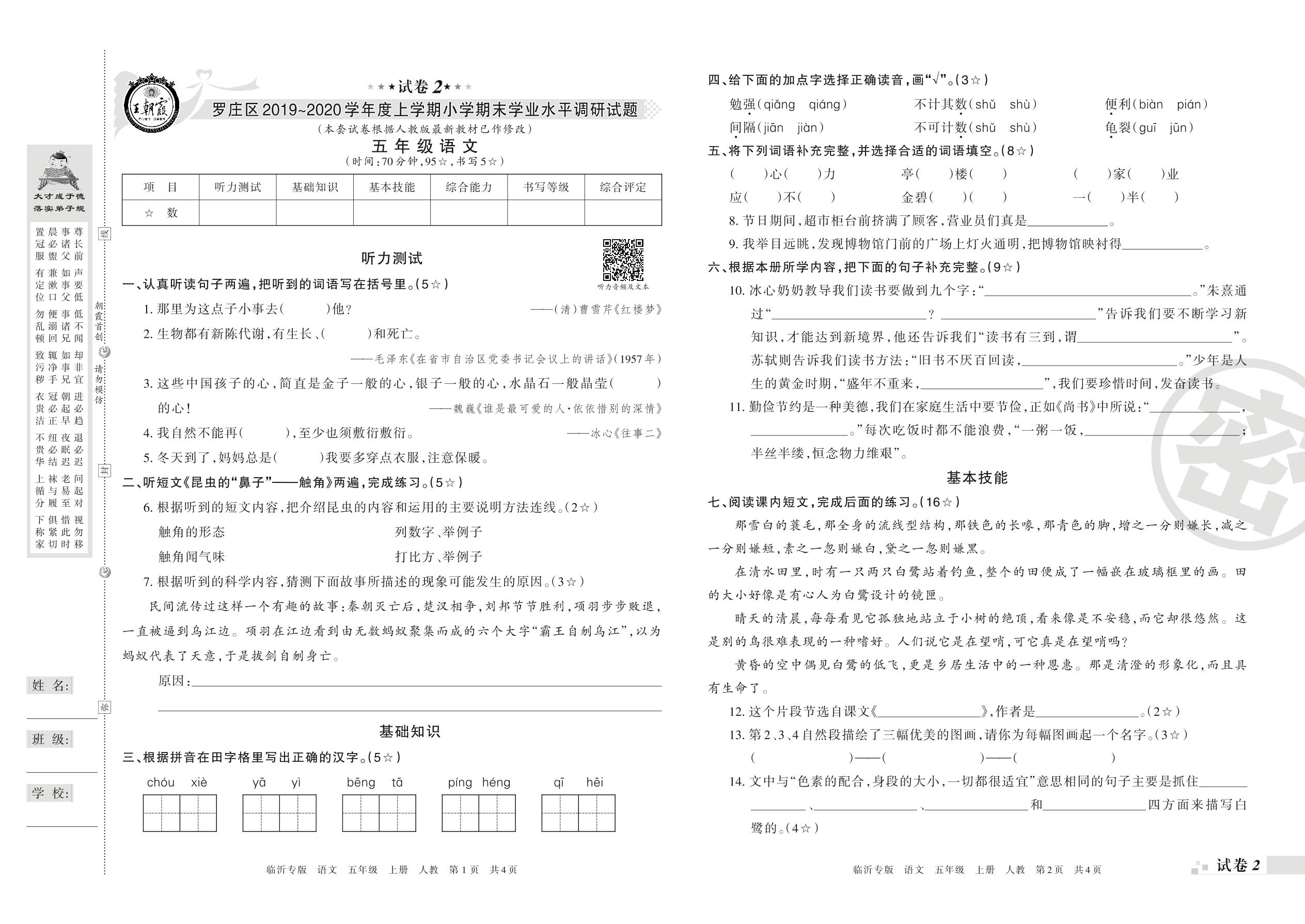 2019-2020学年第一学期临沂市罗庄区五年级语文试卷(人教版)【2】