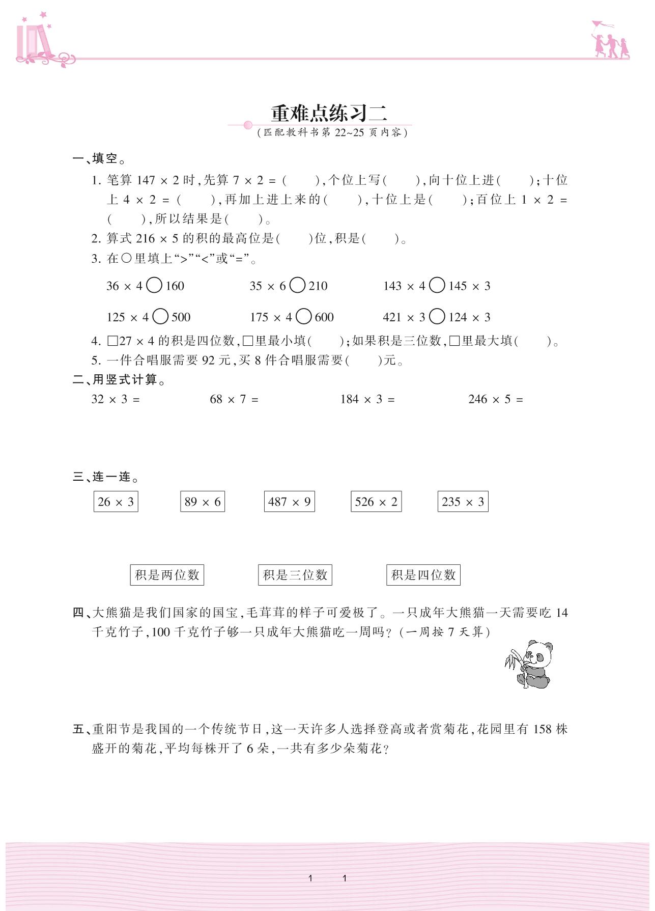 2020上册三年级数学冀教版 二 两、三位数乘一位数——重难点练习二