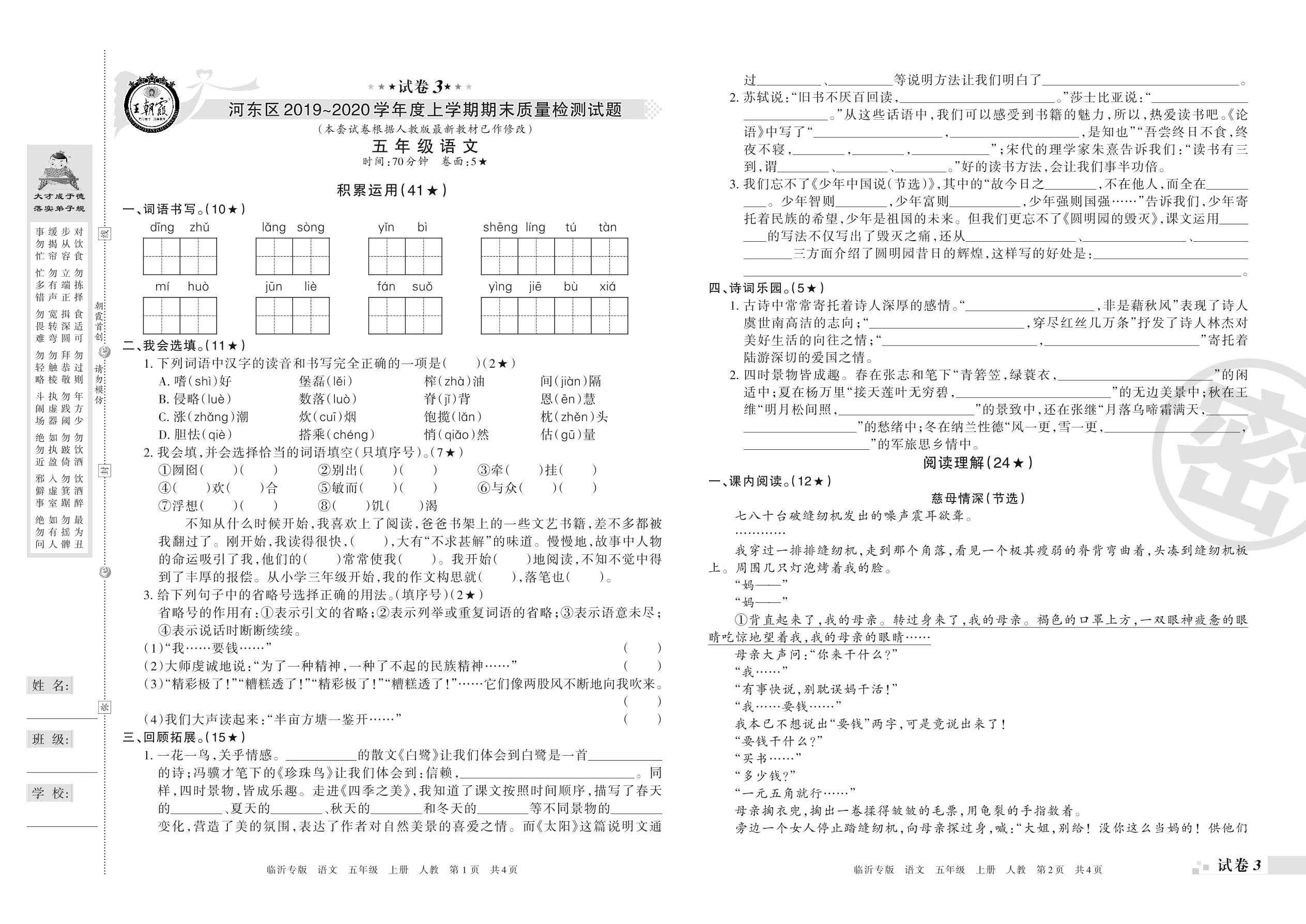 2019-2020学年第一学期临沂市河东区五年级语文试卷(人教版)【3】