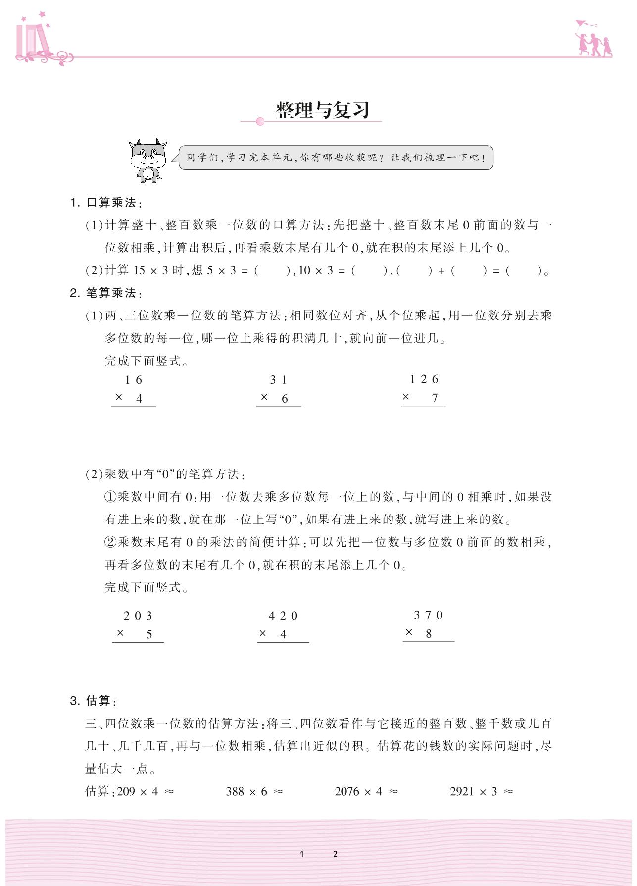 2020上册三年级数学冀教版 二 两、三位数乘一位数——整理与复习