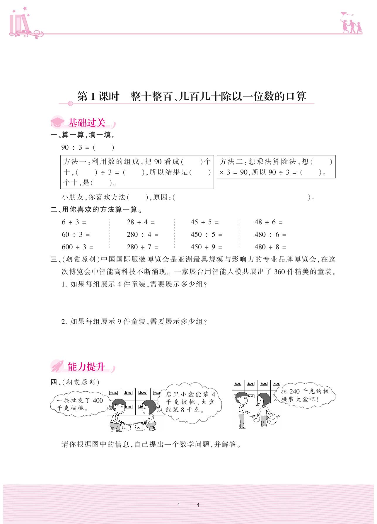 2020上册三年级数学冀教版 四 两、三位数除以一位数——第1课时 整十整百、几百几十除以一位数的口算