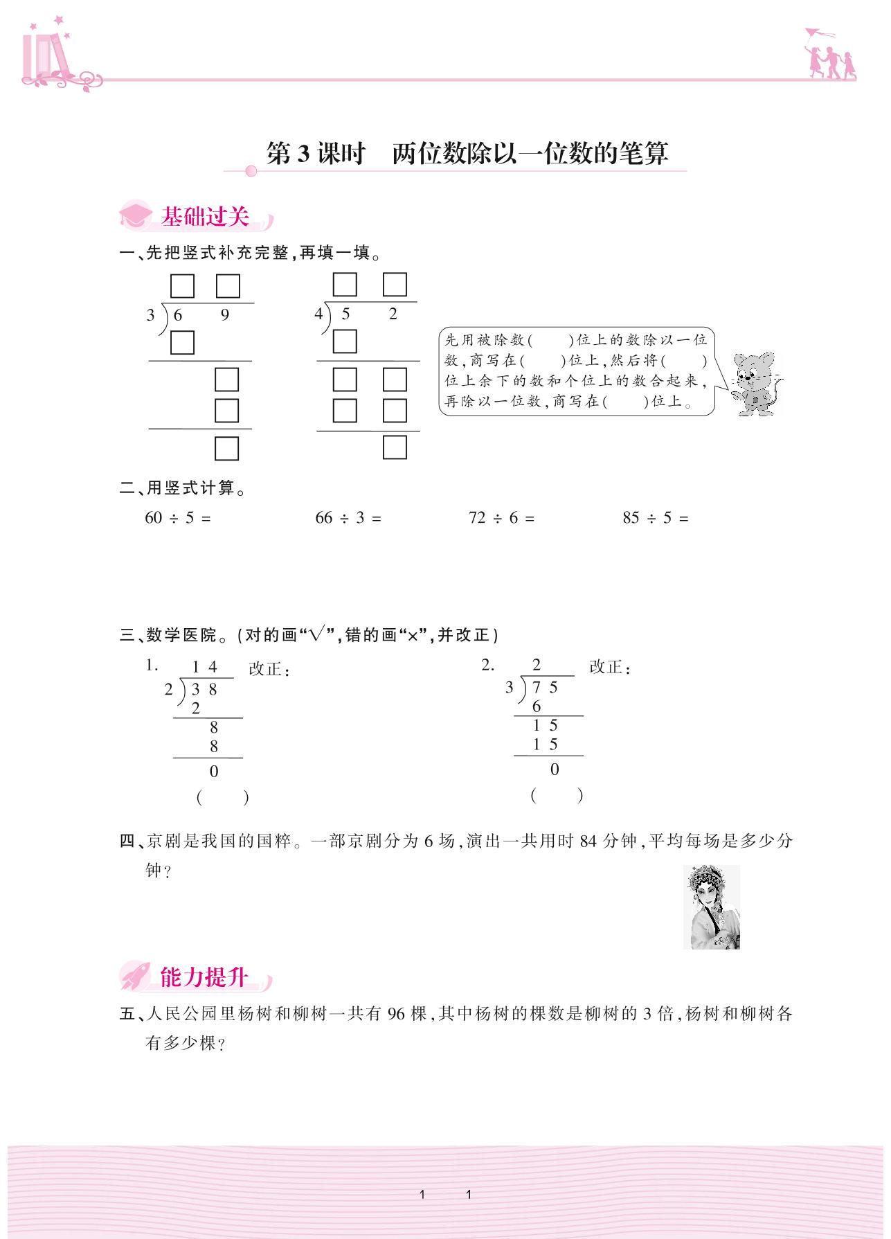 2020上册三年级数学冀教版 四 两、三位数除以一位数——第3课时 两位数除以一位数的笔算