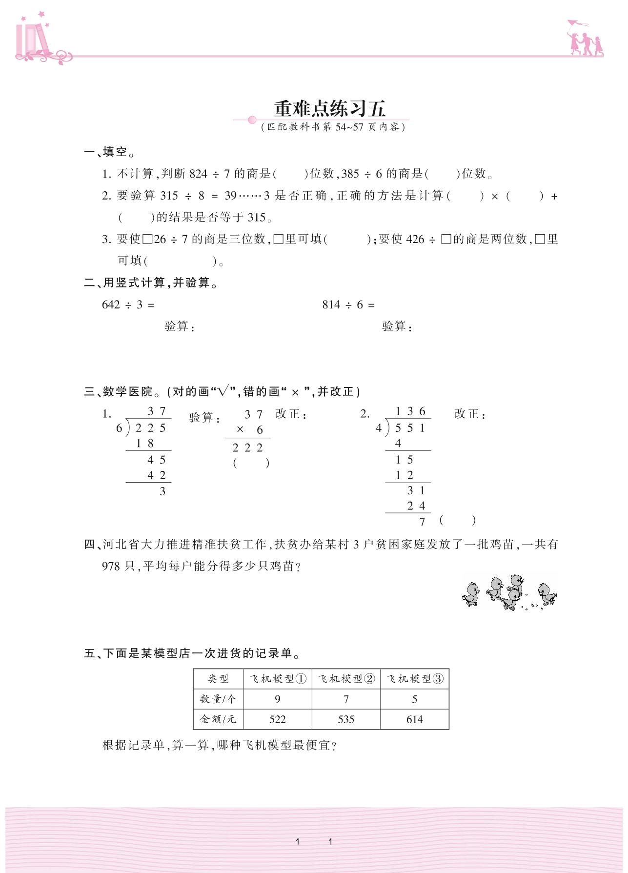 2020上册三年级数学冀教版 四 两、三位数除以一位数——重难点练习五