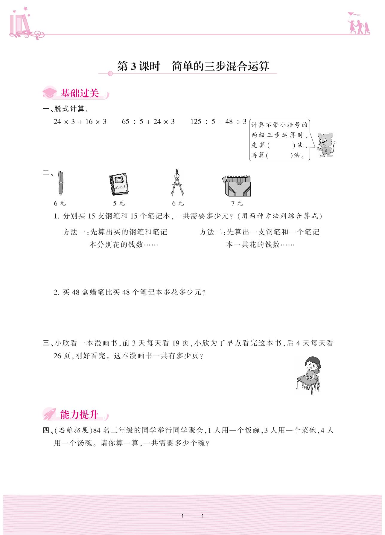 2020上册三年级数学冀教版 五 四则混合运算(一)——第3课时 简单的三步混合运算