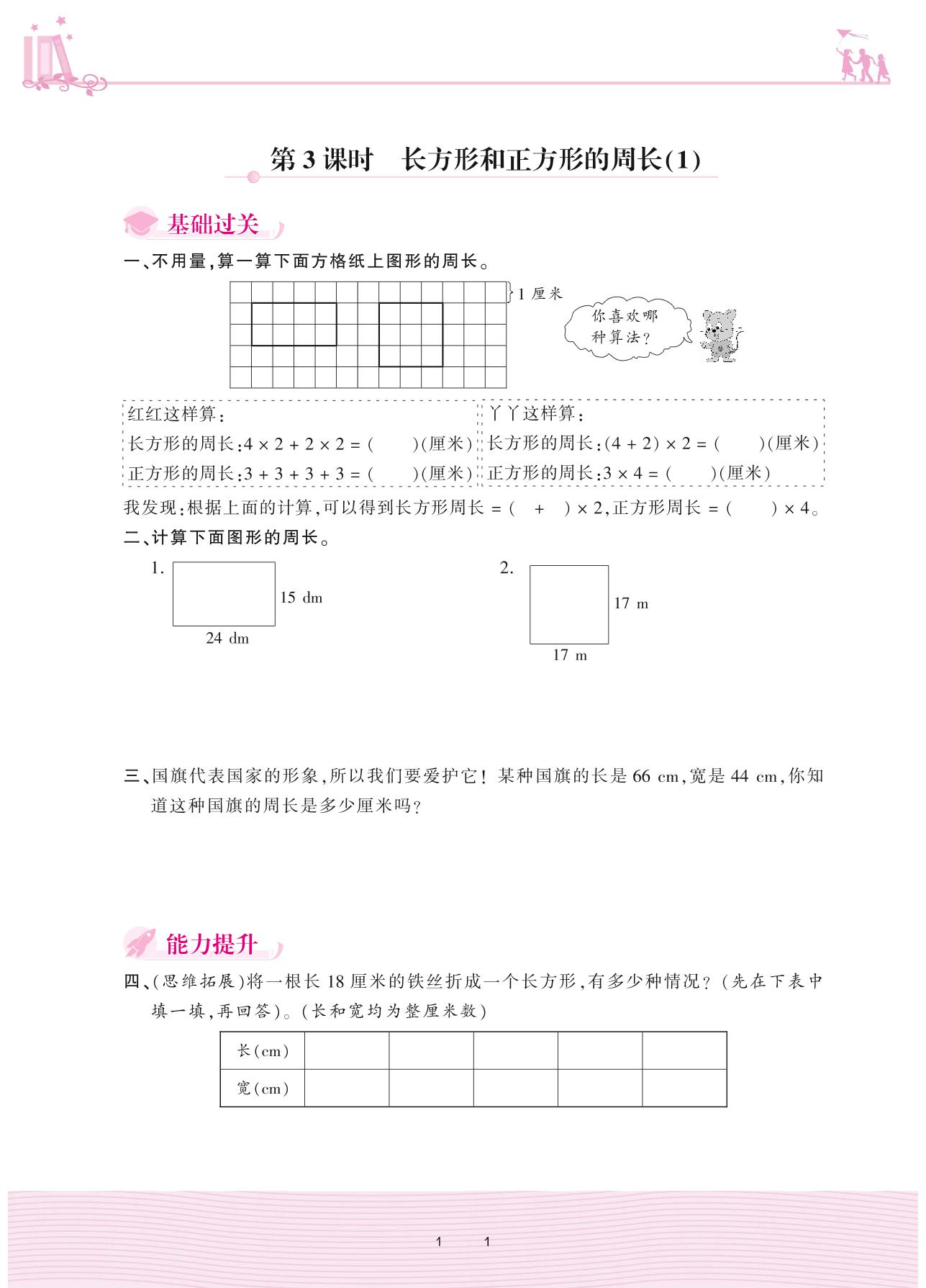 2020上册三年级数学冀教版 六 长方形和正方形的周长——第3课时 长方形和正方形的周长(1)