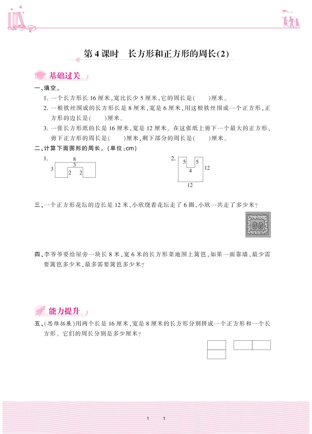 2020上册三年级数学冀教版 六 长方形和正方形的周长——第4课时 长方形和正方形的周长(2)