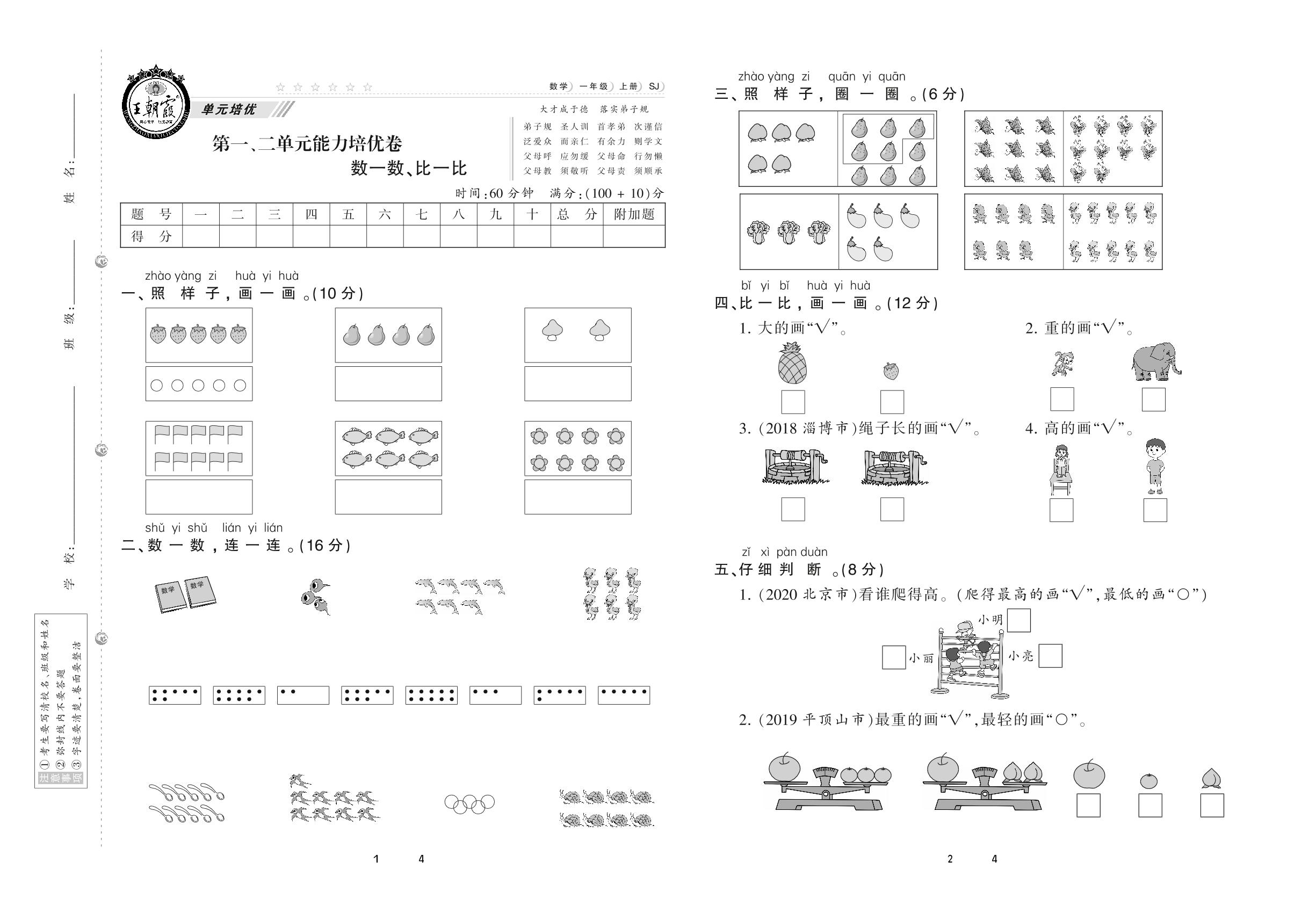 2020上册一年级数学苏教版 第一、二单元 能力培优卷