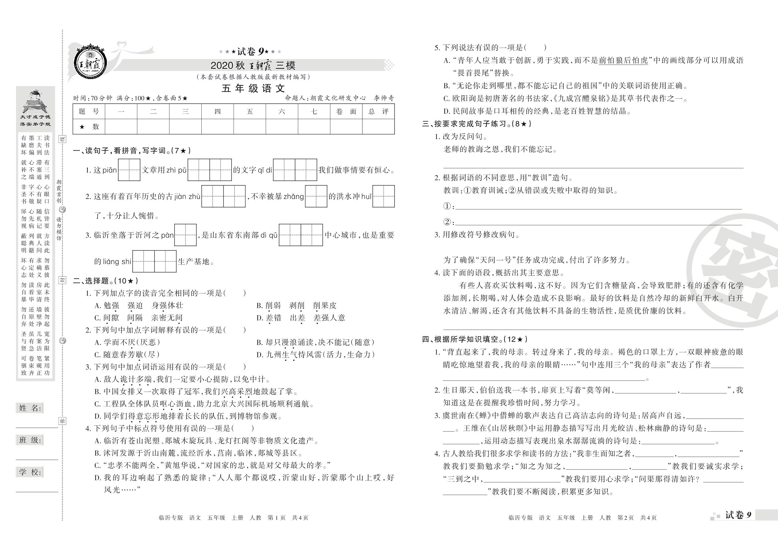 王朝霞期末模拟卷五年级上册语文(人教版)_R210801185114【9】