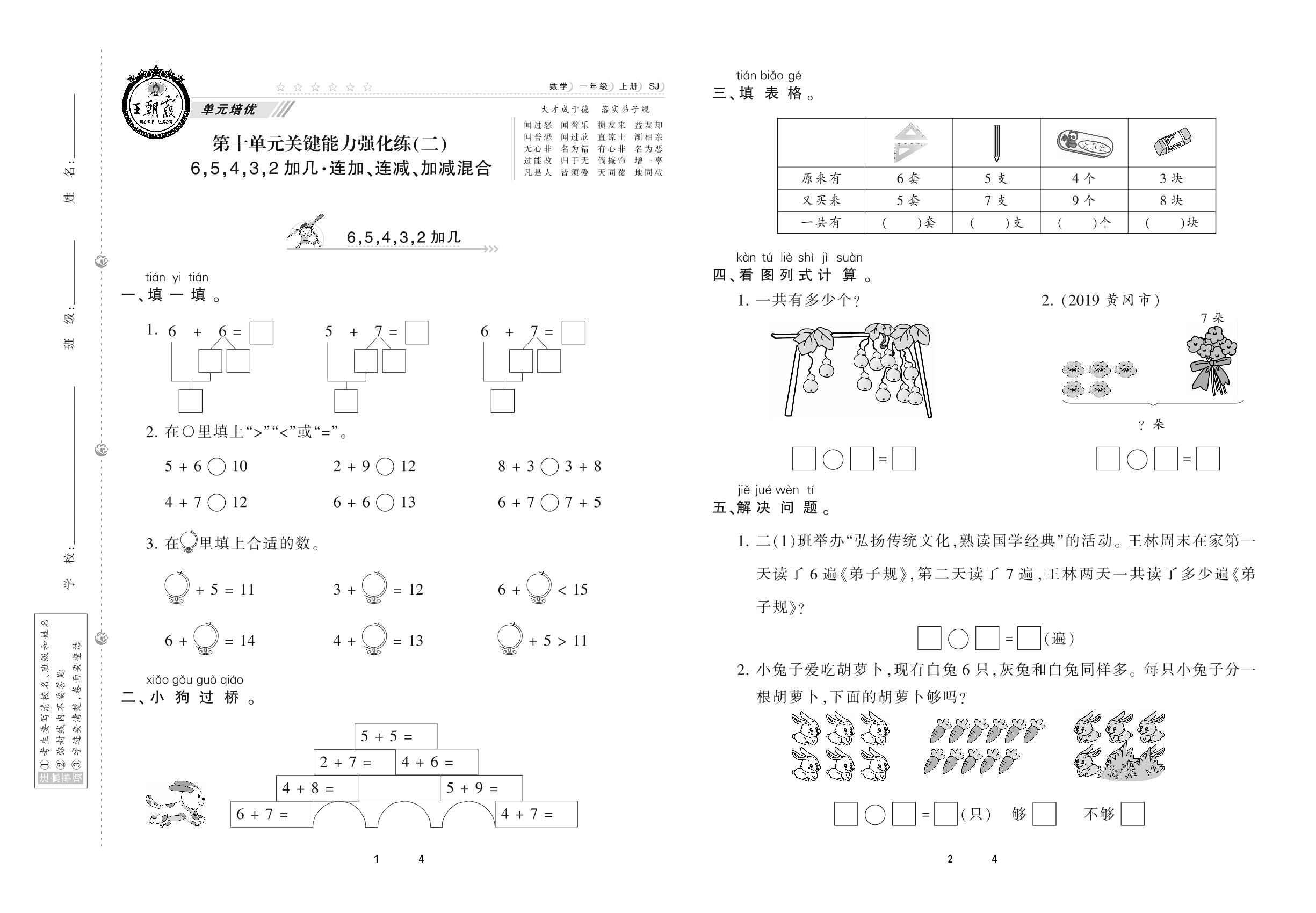 2020上册一年级数学苏教版 第十单元 关键能力强化练(二)