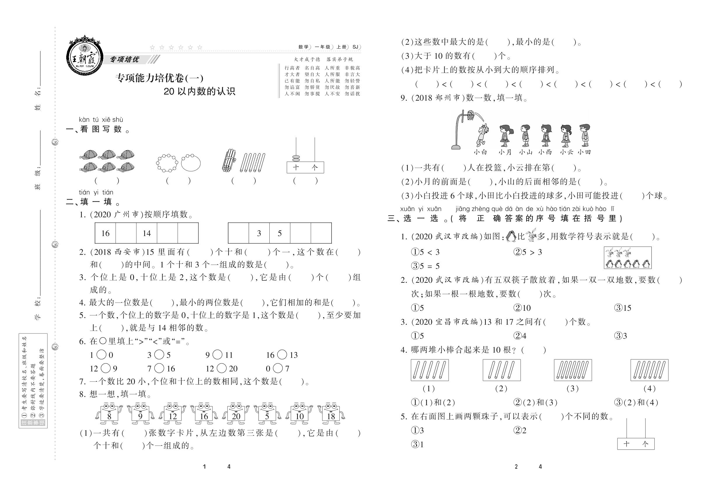 2020上册一年级数学苏教版 专项能力培优卷(一) 20以内数的认识