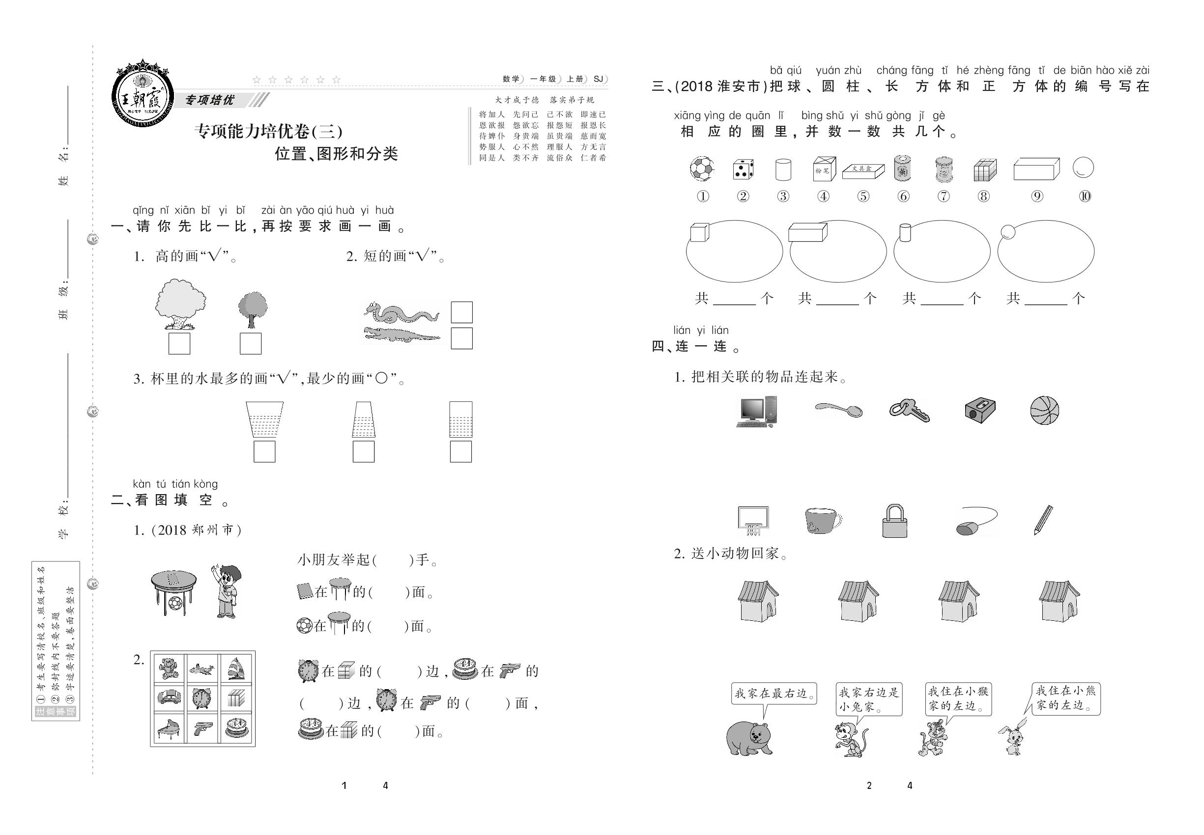 2020上册一年级数学苏教版 专项能力培优卷(三) 位置、图形和分类