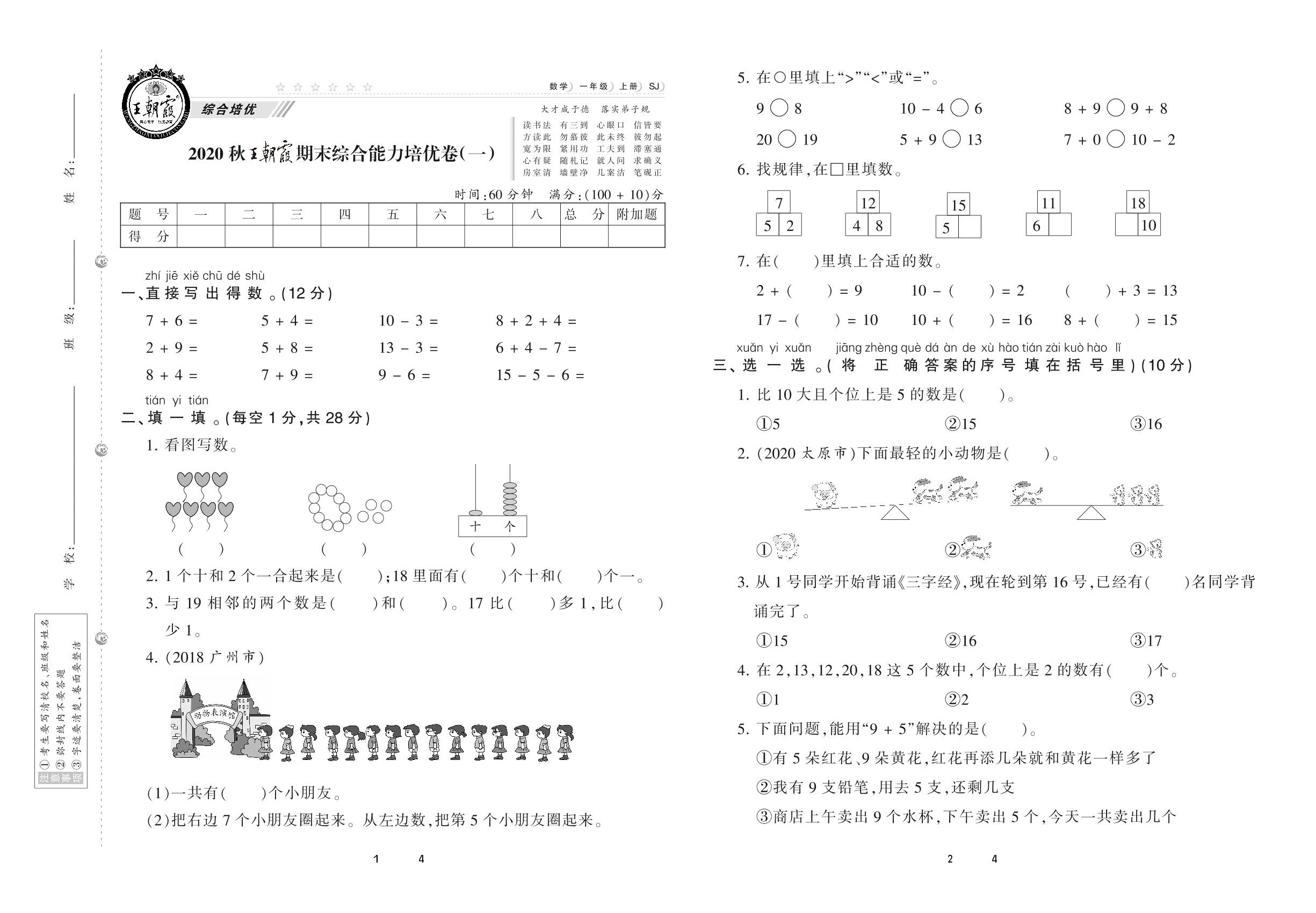 2020上册一年级数学苏教版 王朝霞期末综合能力培优卷(一)