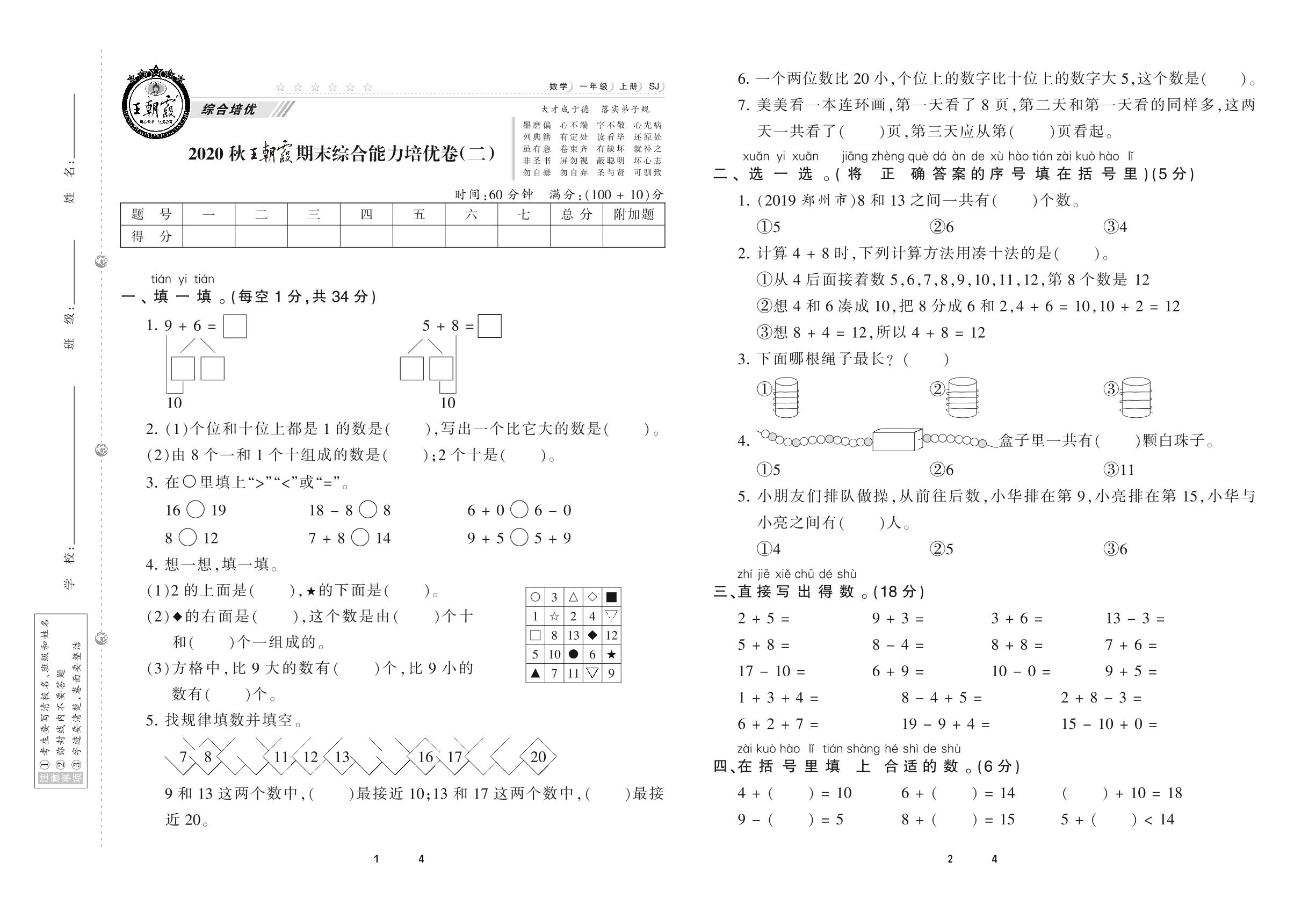 2020上册一年级数学苏教版 王朝霞期末综合能力培优卷(二)