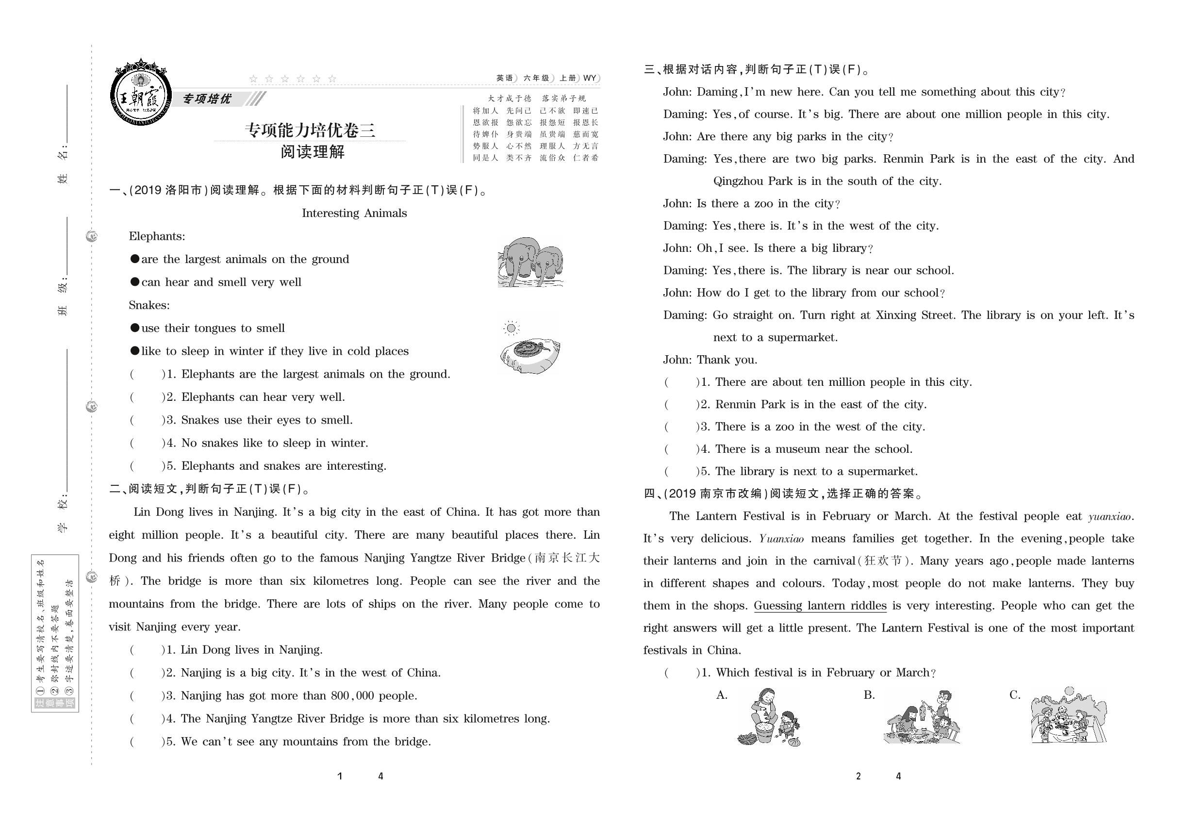 2020上册六年级英语外研版 专项能力培优卷三 阅读理解
